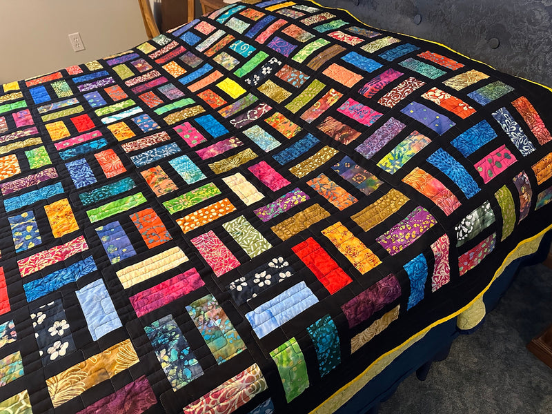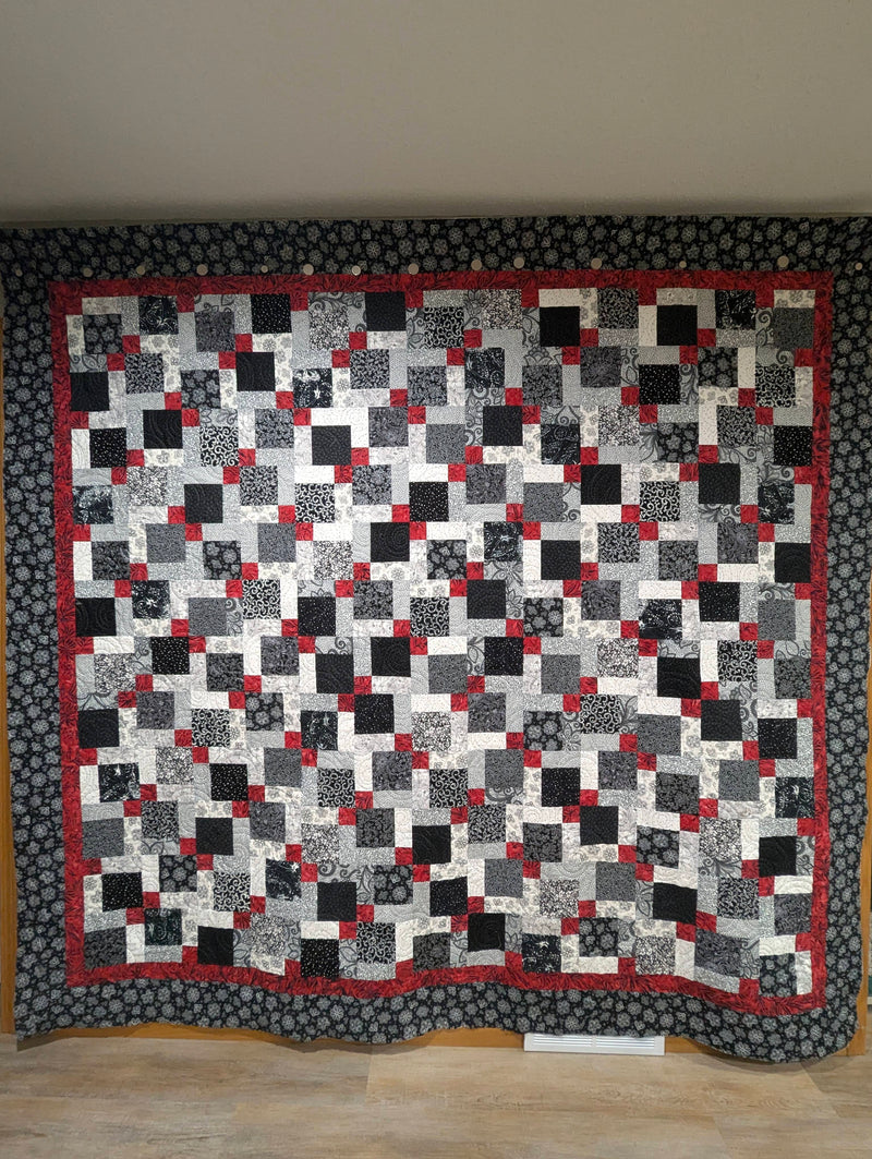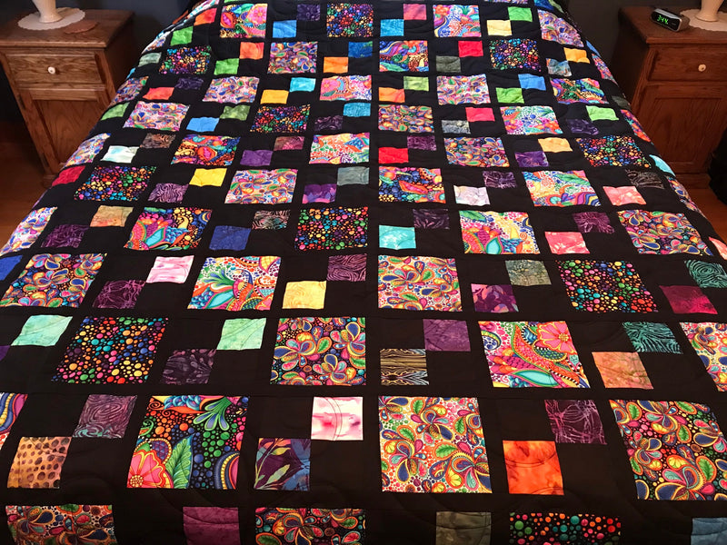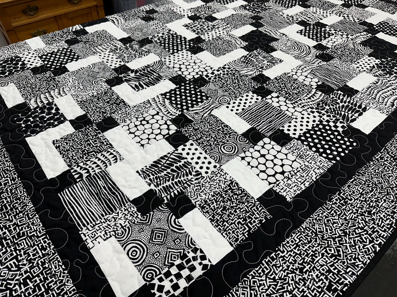 An exciting black and white lap quilt using Kaffe Fassett fabrics.