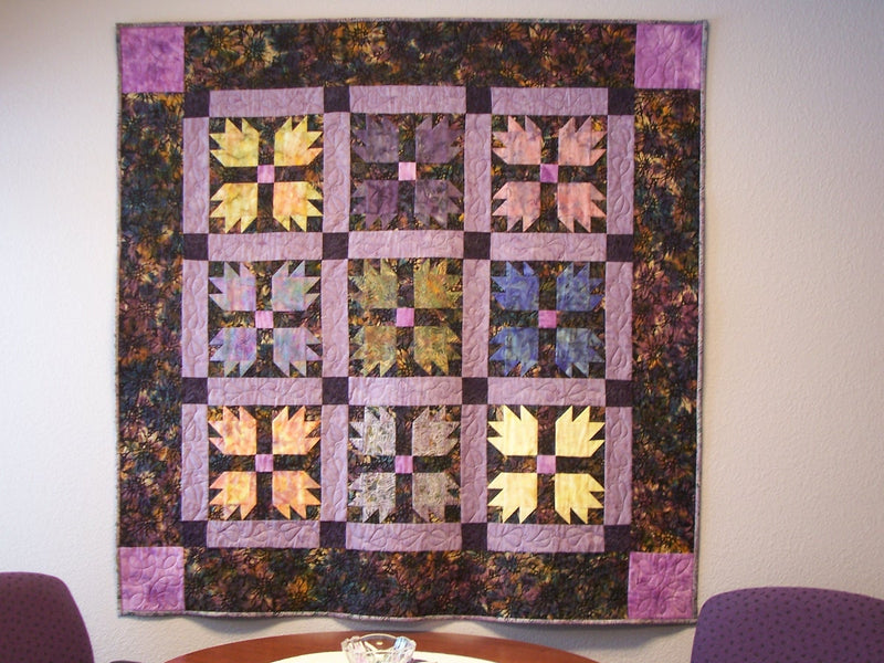 A purple batik Bear Paw pattern 60" square wall hanging.