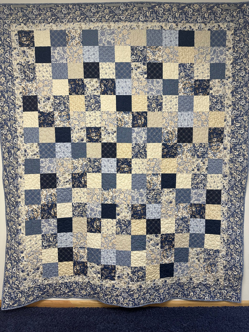 Blue and Cream Patchwork Quilt using the "Radiance" fabric collection.