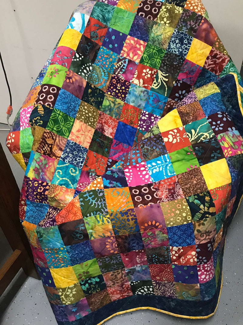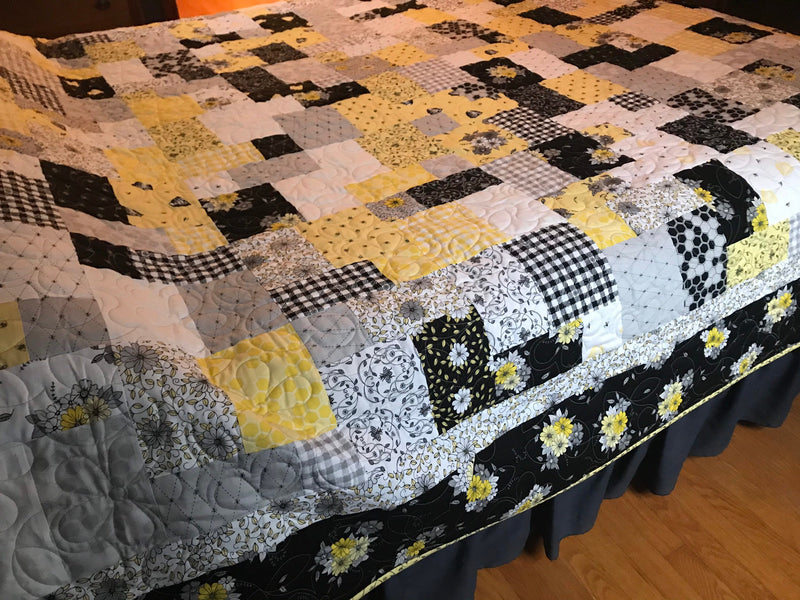 A fun blue and yellow lap quilt using "Sunshine and Blue Skies" fabric.