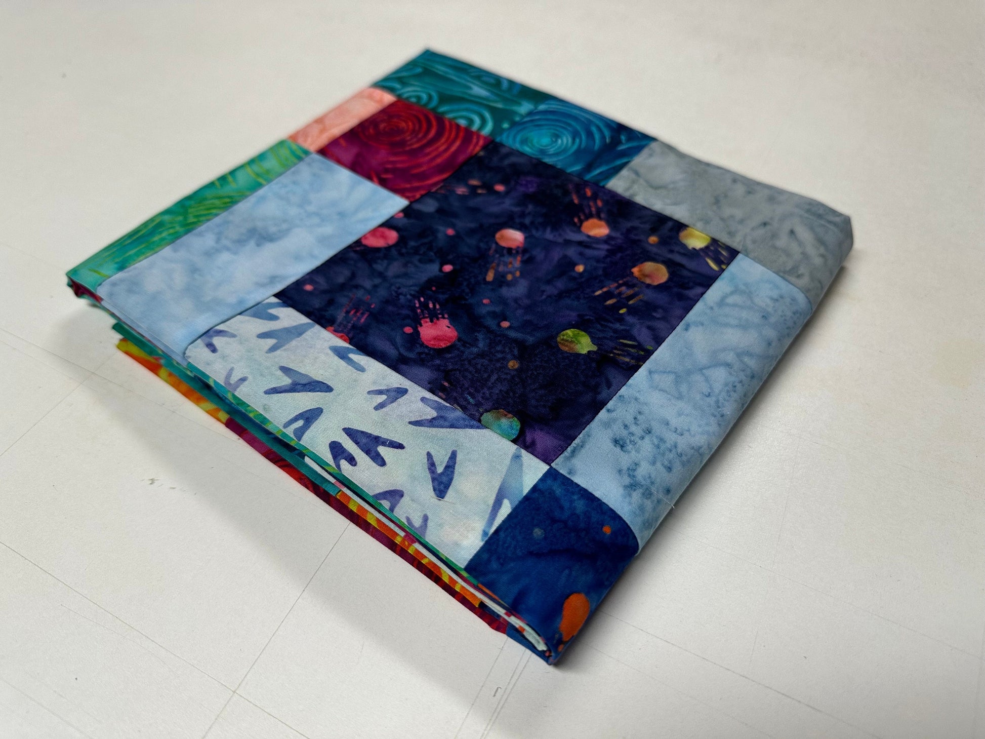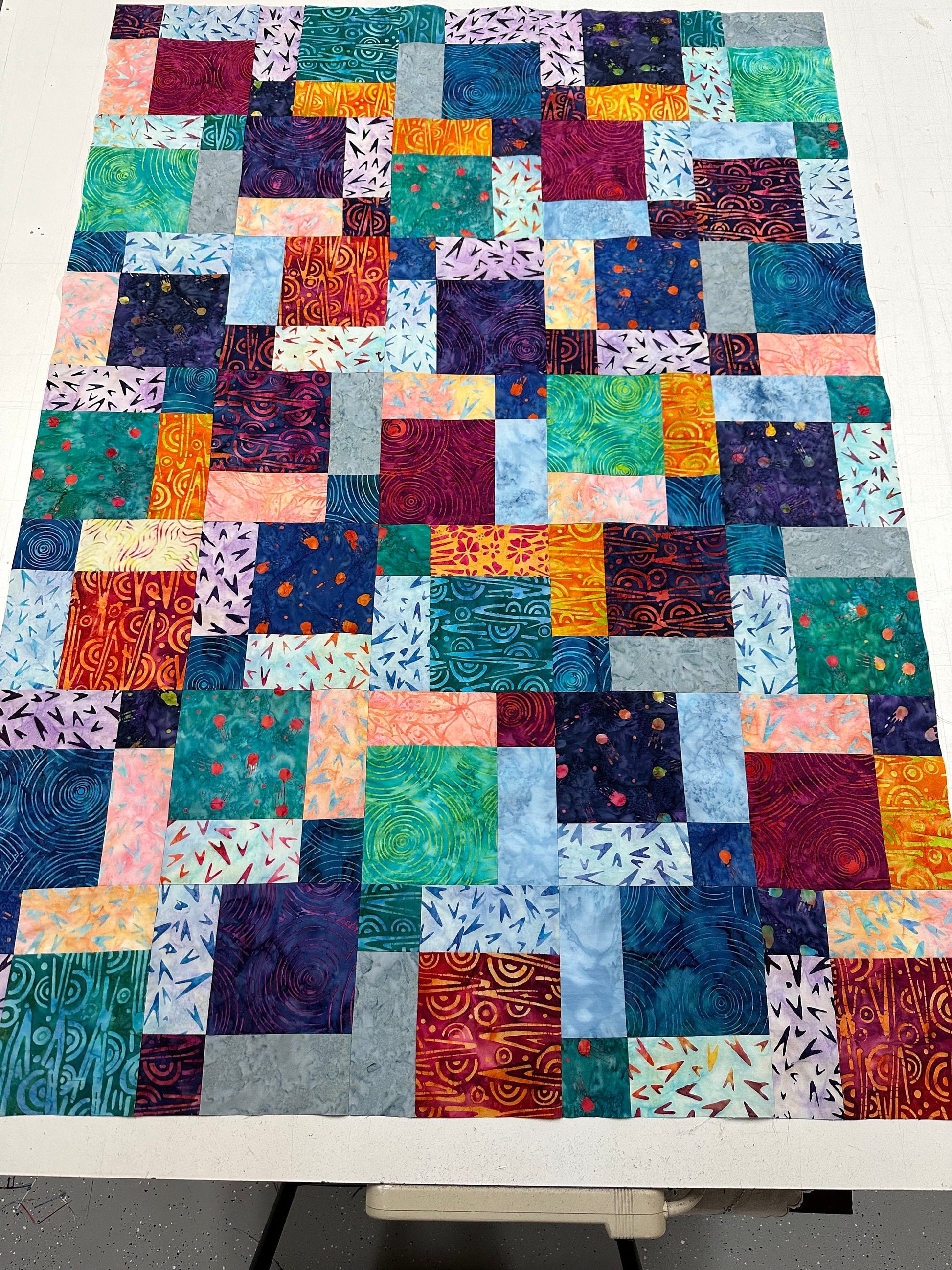 A beautiful new handmade unfinished quilt top (33" x 46" - crib size) made with rainbow colored batik fabrics. The colors are fun blues, greens, purples, oranges, and yellows.