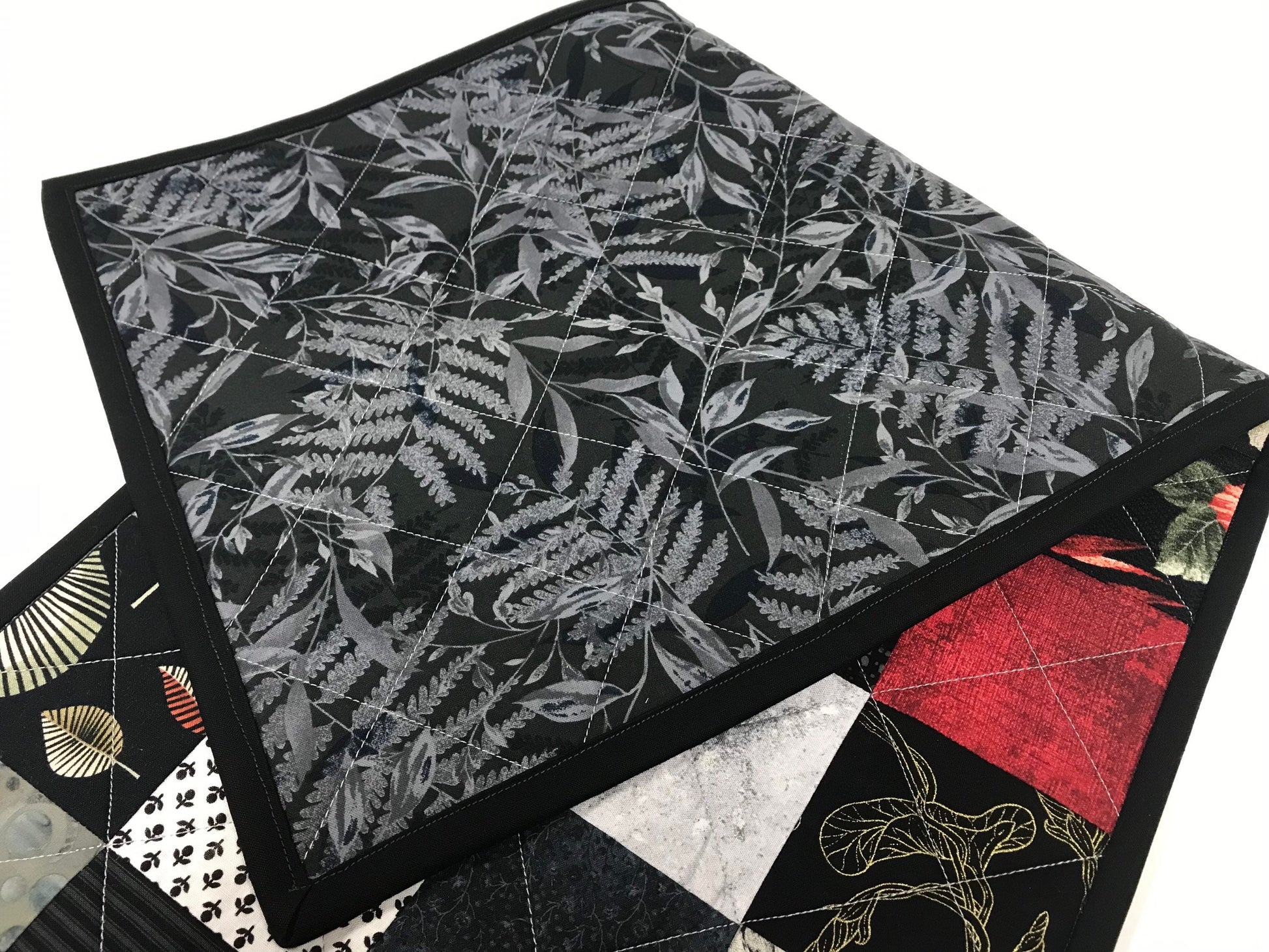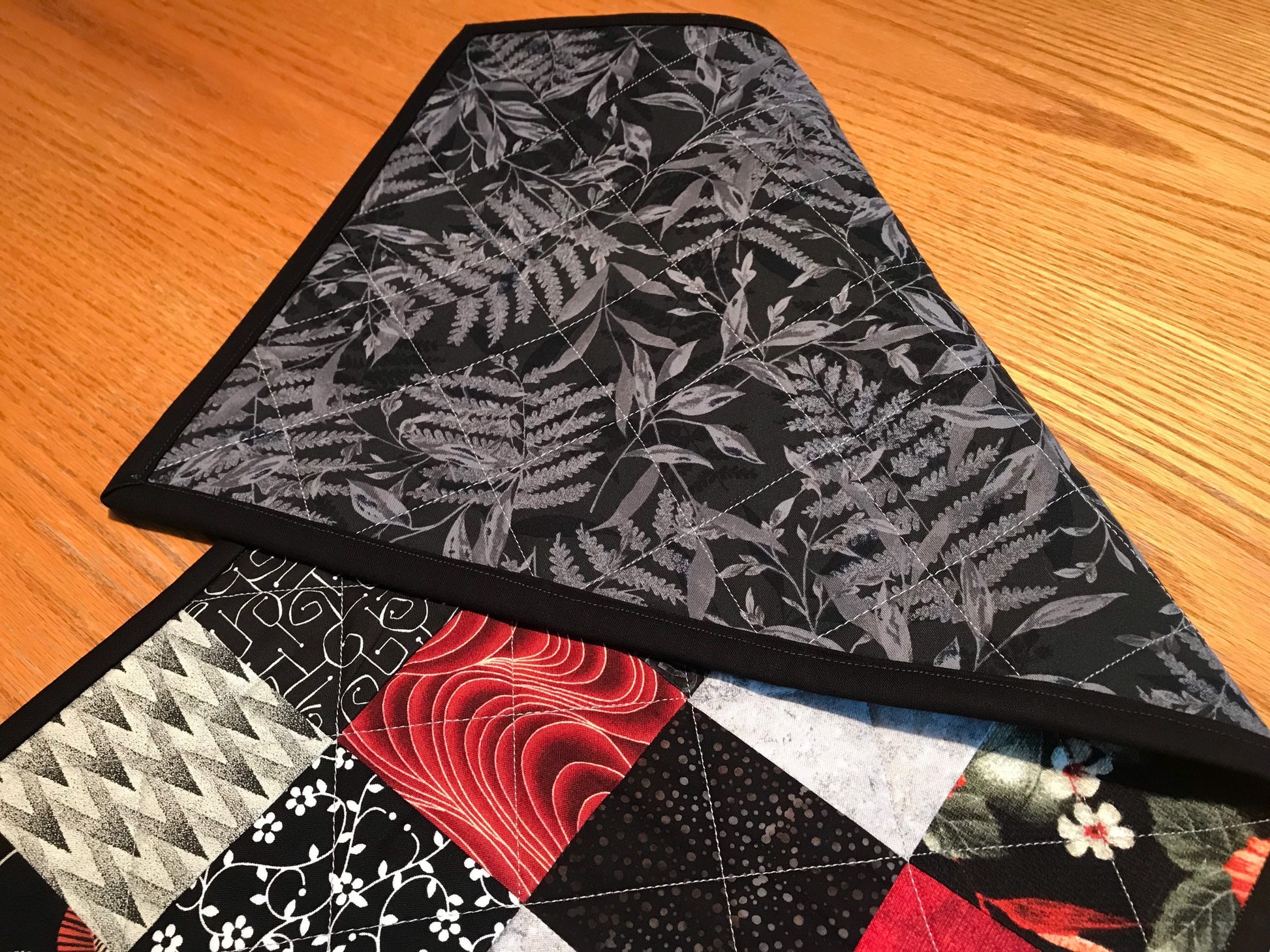 Brighten up your kitchen with this handmade quilted table runner. It is 12.5" x 39.5" and made with black red, gray, and cream floral and stylized prints. The binding is solid black and the backing is a black and gray floral stylized leaf print.