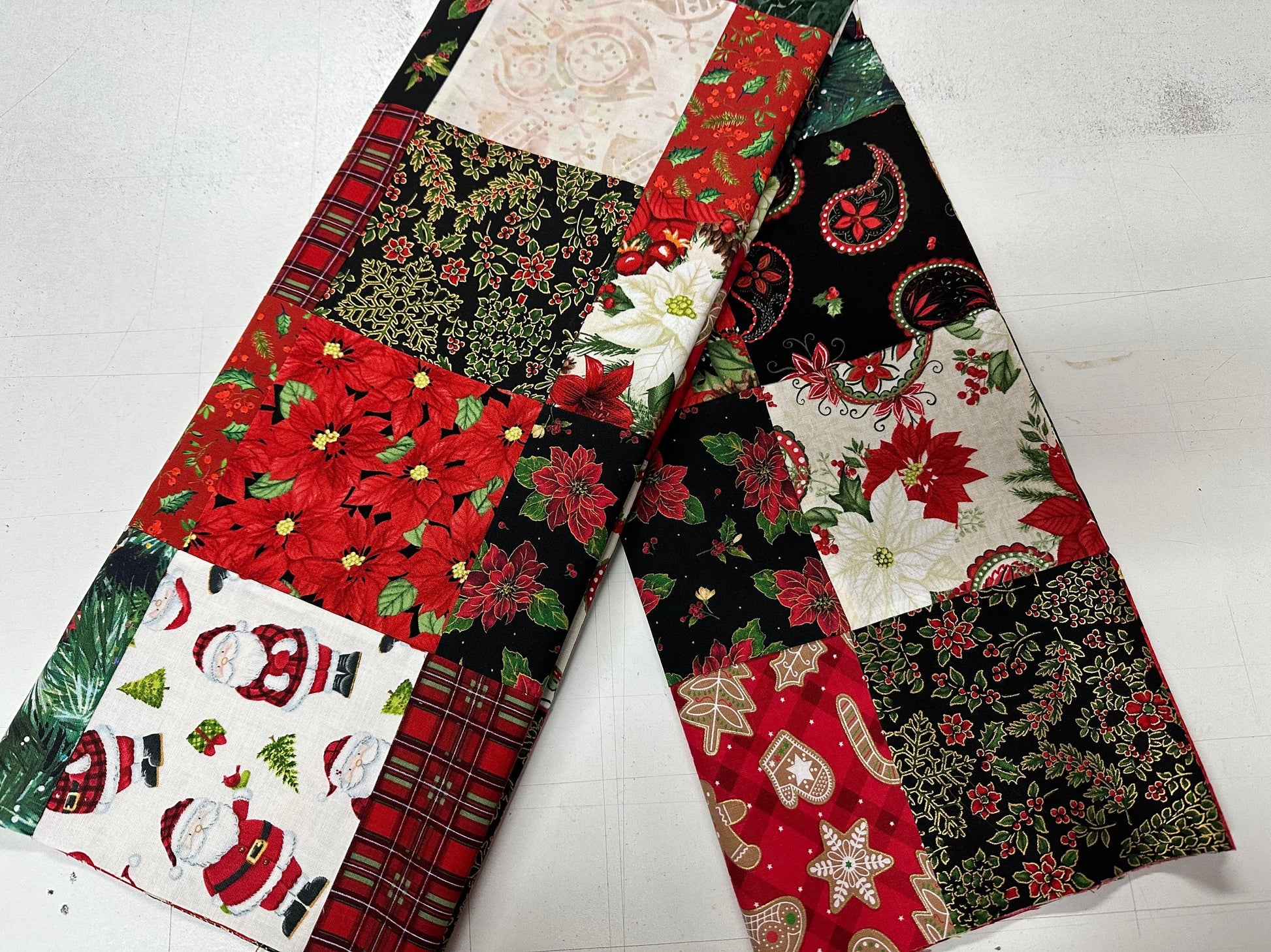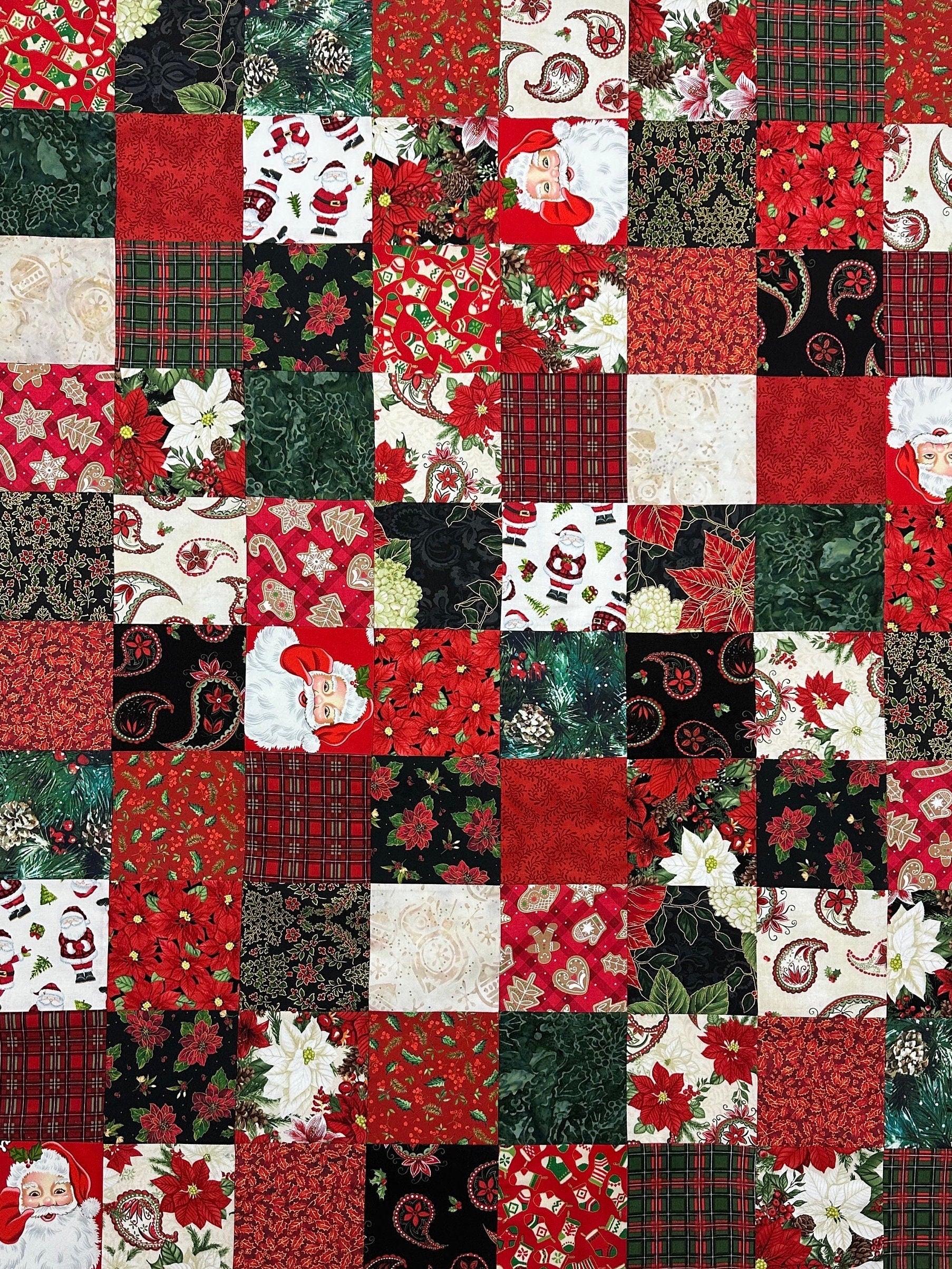 This is a traditional patchwork pattern and many of the blocks contain Santas, reindeer, and holly leaves. Some fabrics have metallic highlights. Zoom in on the photos for a closer look at the blocks. This would make a beautiful wall quilt, lap, or throw for your home. You might want to grab this now so you have enough time to complete it before you are ready to decorate for the holidays.