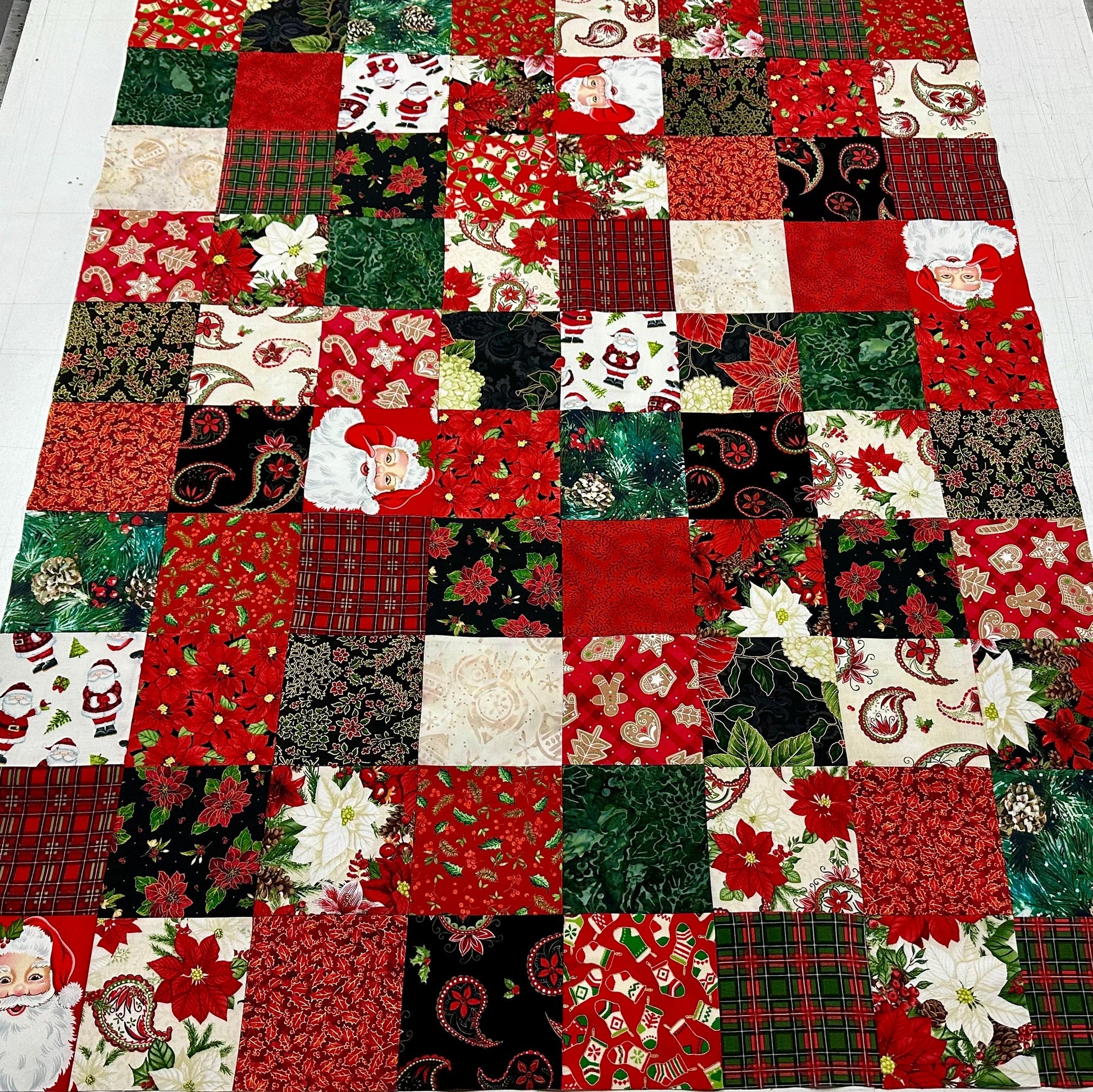A handmade patchwork Christmas quilt top in traditional Christmas reds and greens. It is ready for you to finish to your liking. The piecing has already been done for you and you will receive the top stitched together as shown. You will need to provide backing, batting, quilting, and binding. This could be a fun fall project for those of you who love to quilt but not piece.