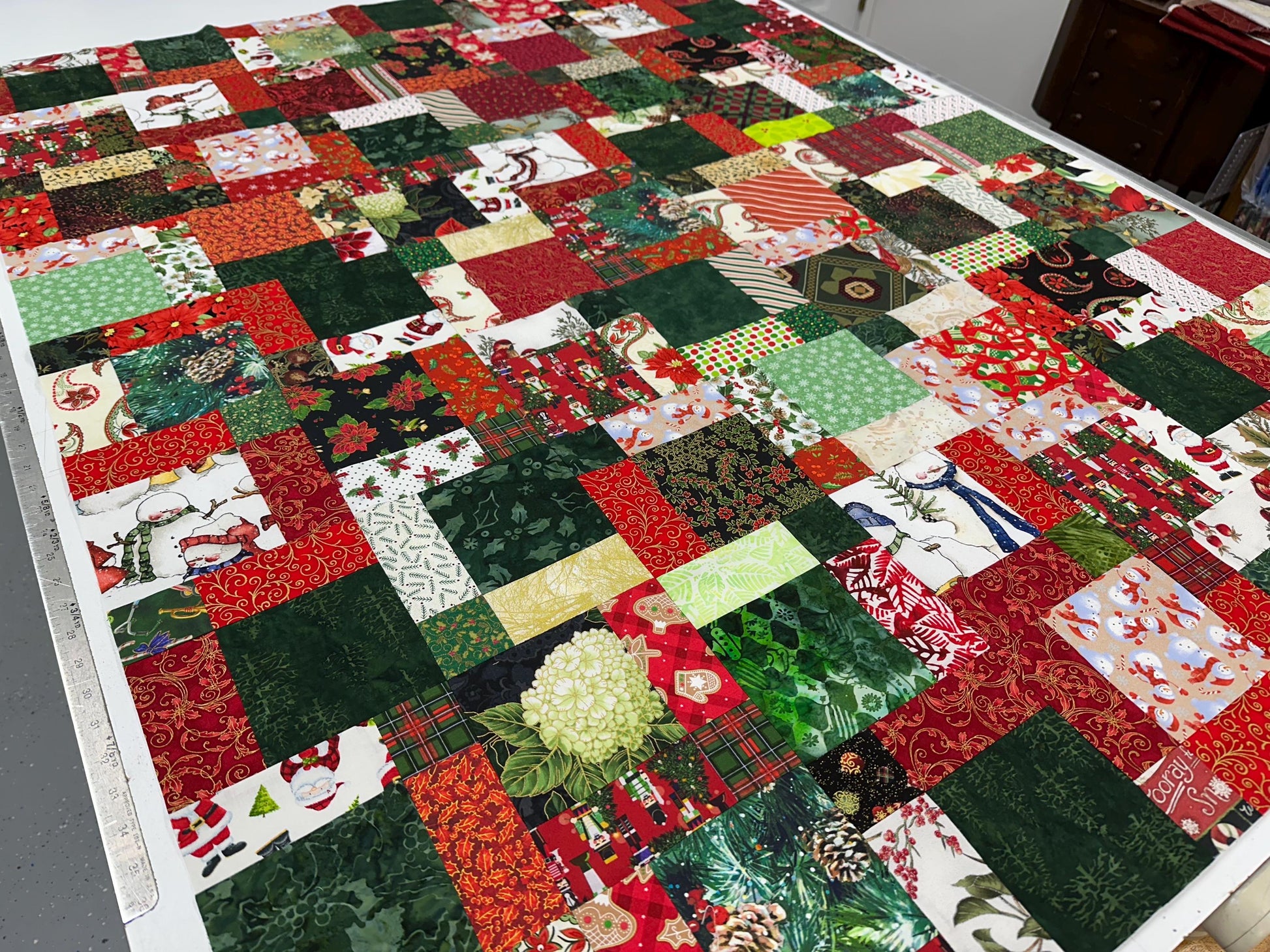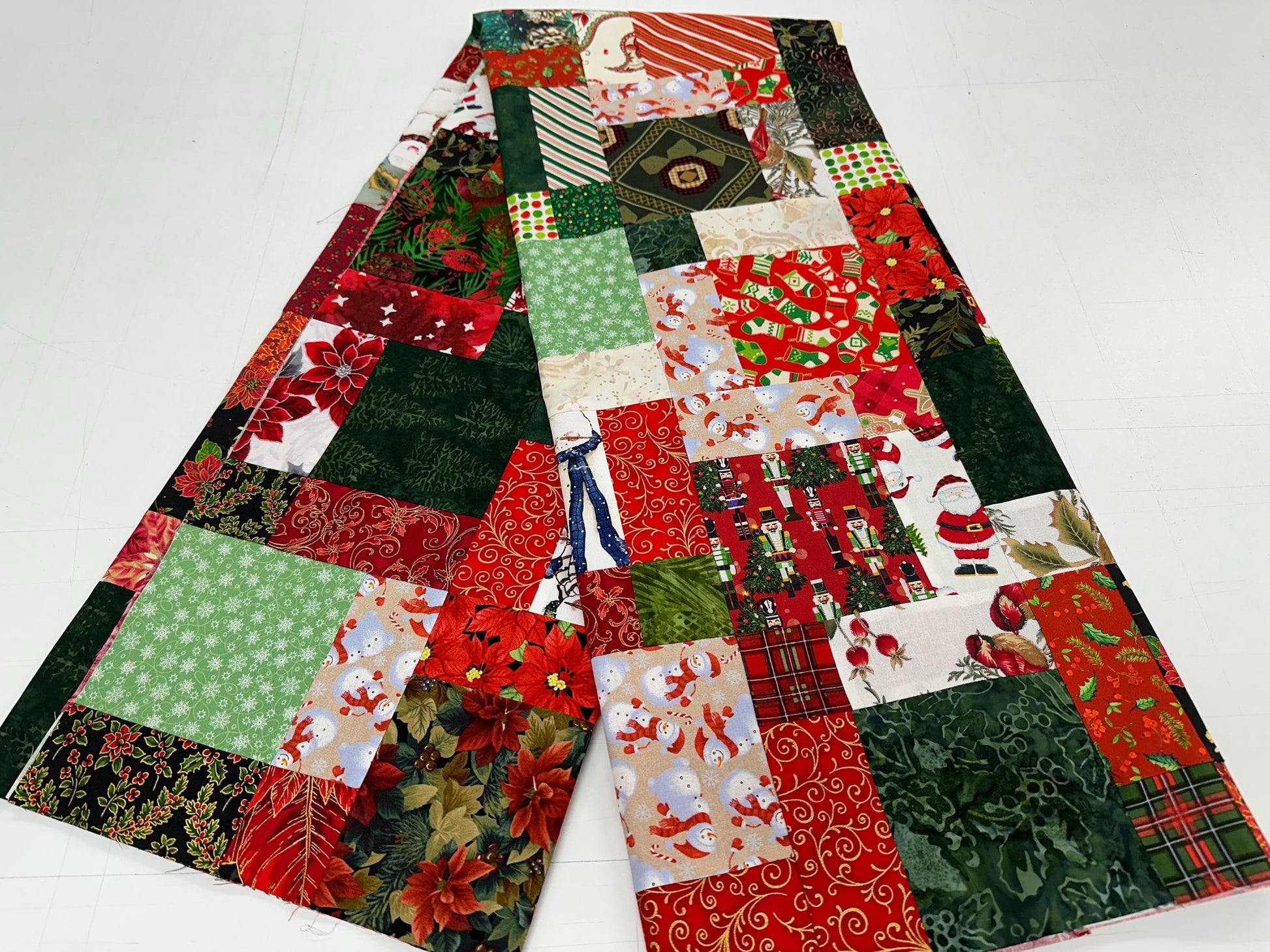A handmade Christmas unfinished quilt top in traditional Christmas reds and greens. It is ready for you to finish to your liking. The piecing has already been done for you and you will receive the top stitched together as shown. You will need to provide backing, batting, quilting, and binding. This could be a fun holiday project for those of you who love to quilt but not the piecing.