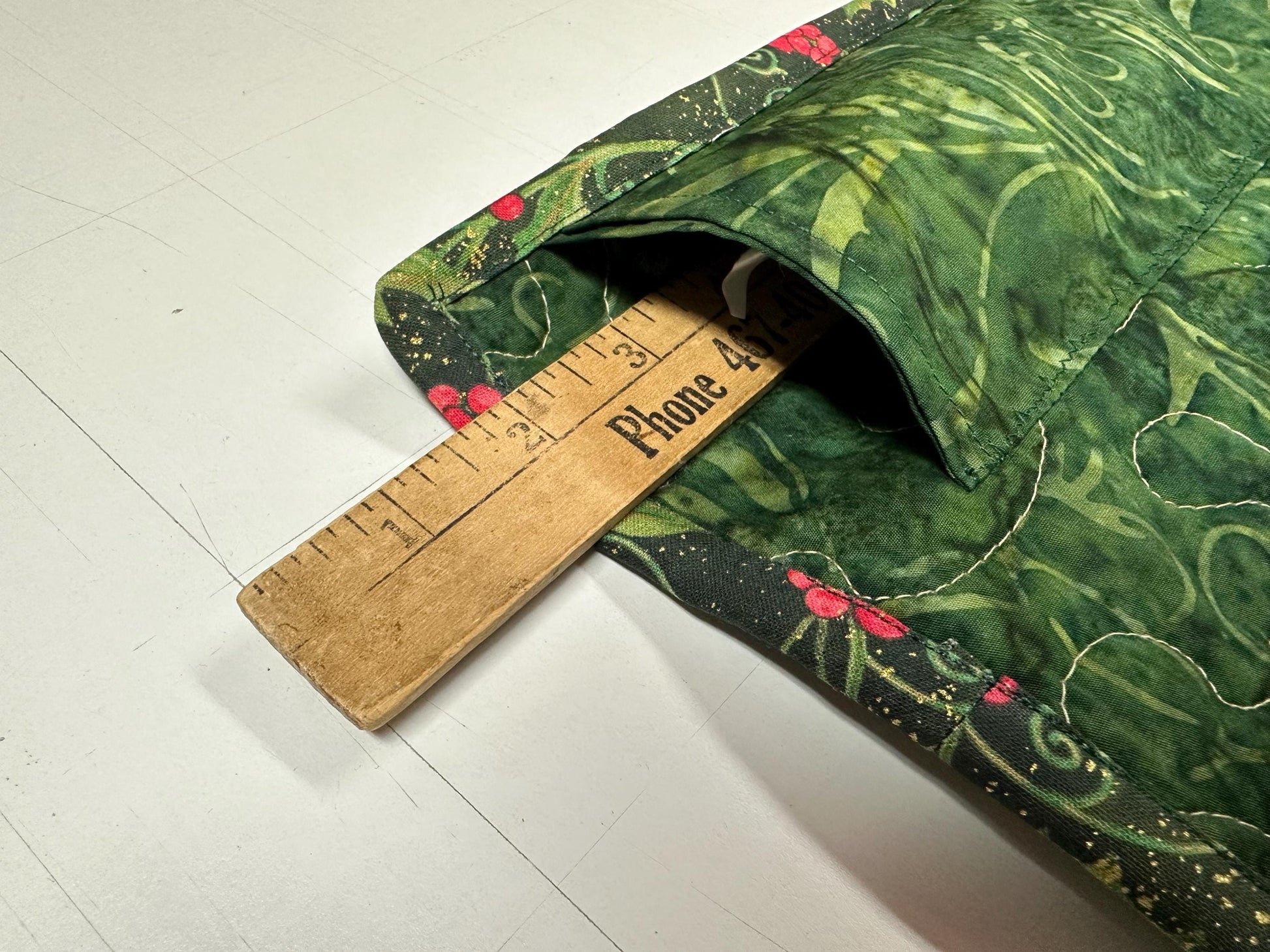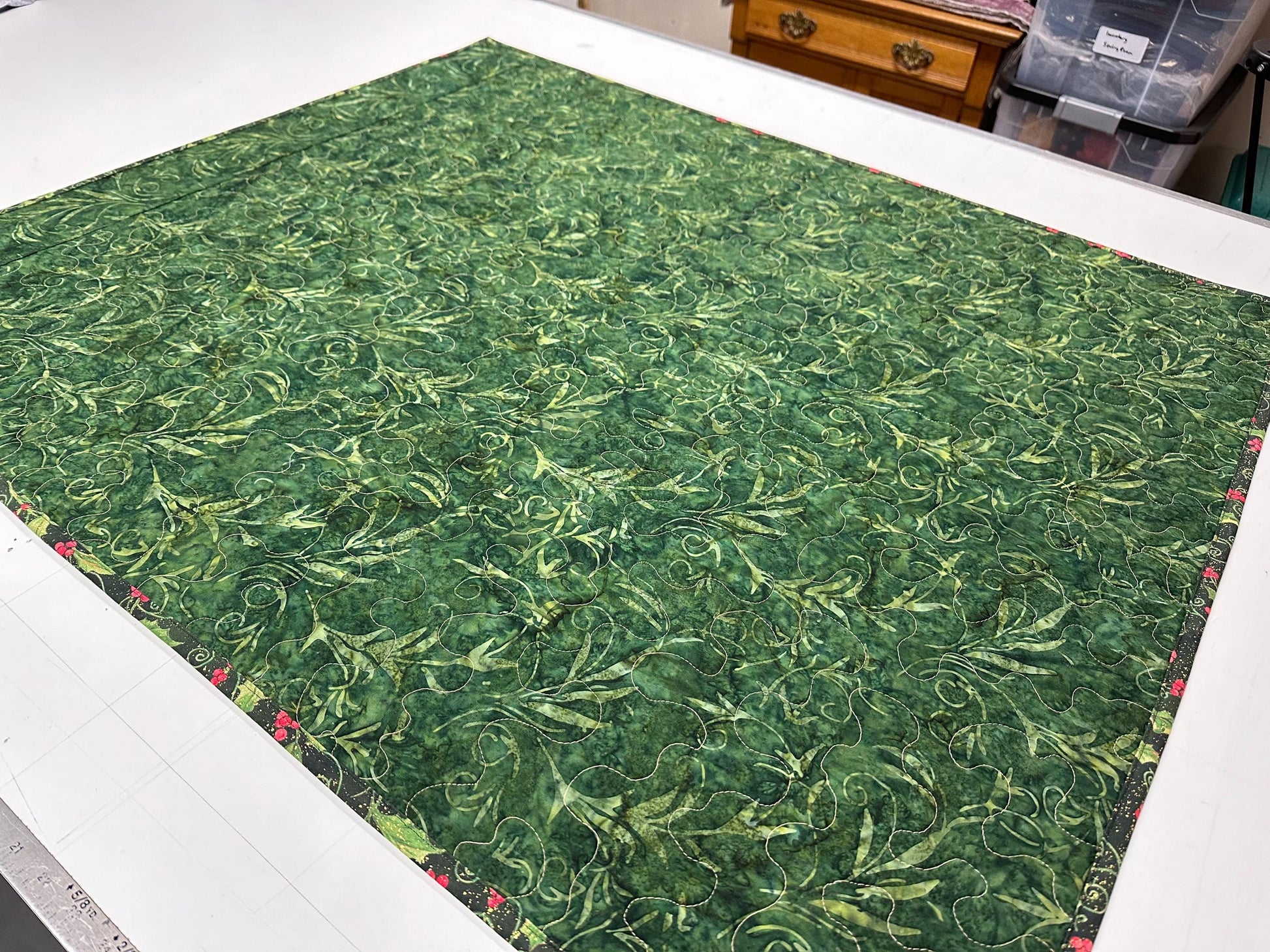 This Christmas blanket uses Hobbs 80/20 batting and is machine quilted with a tan thread and a meandering allover design.