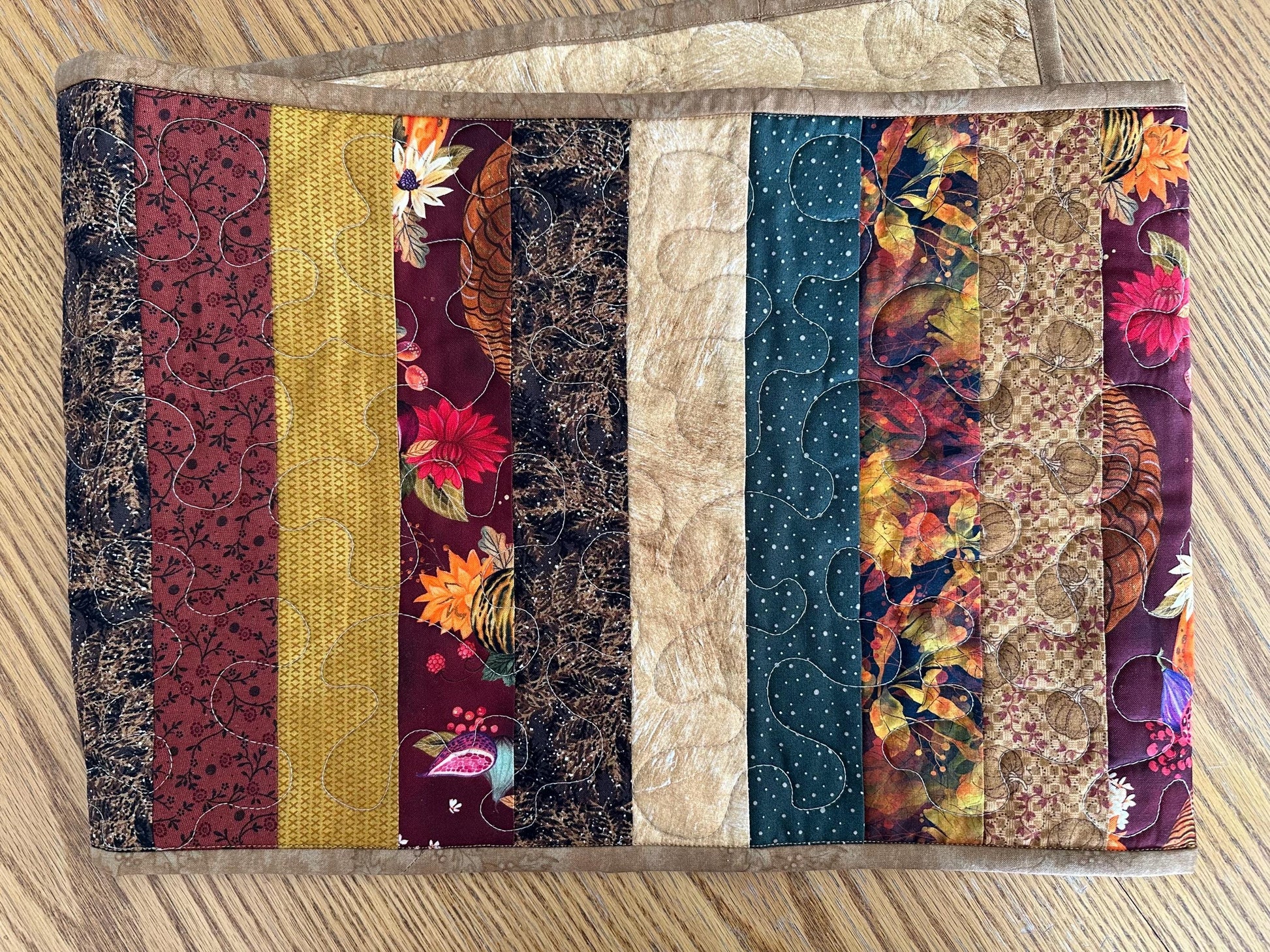 The backing is a wheat colored print and the binding is a complimentary tan floral fabric. At this size it would fit nicely on most kitchen or dining room tables. Use this fall table runner for Thanksgiving dinner. It is finished, packaged, and ready to ship in one business day.