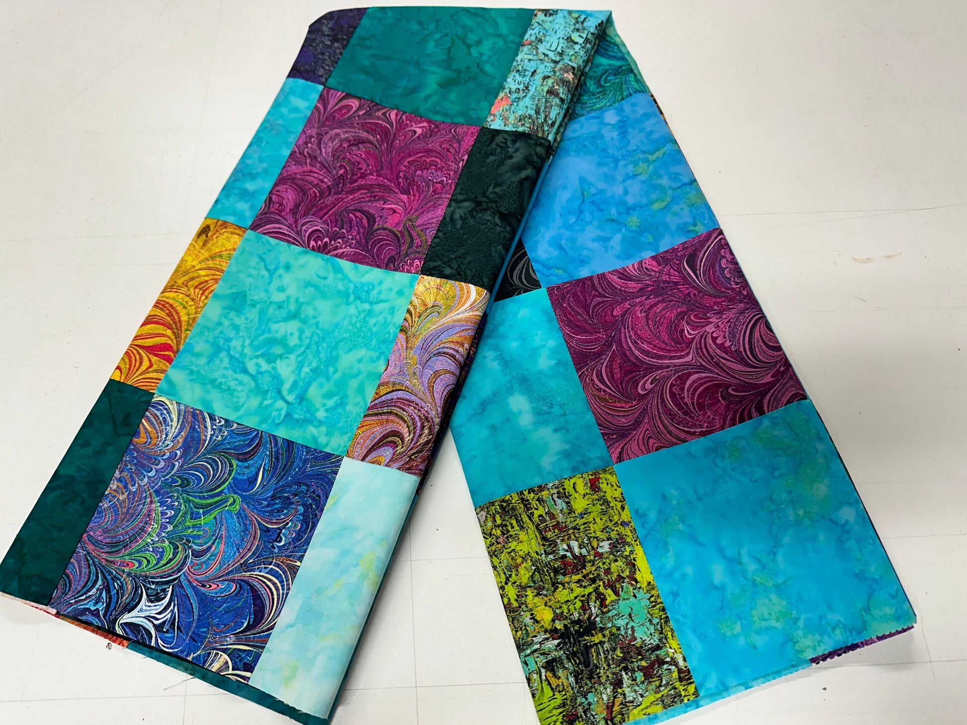 A beautiful new handmade batik unfinished quilt top (36" x 45") made of quilt shop quality 100% cotton batik fabrics in all shades of the rainbow. The bright saturated colors of the crib size quilt top add color to a room. You receive the batik quilt top as shown, already pieced together. You will need to provide your own backing, batting, quilting, and binding. You could also add borders to make this quilt larger.