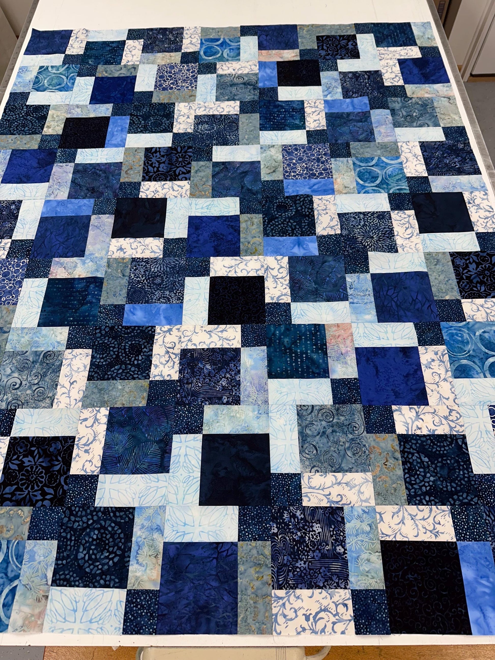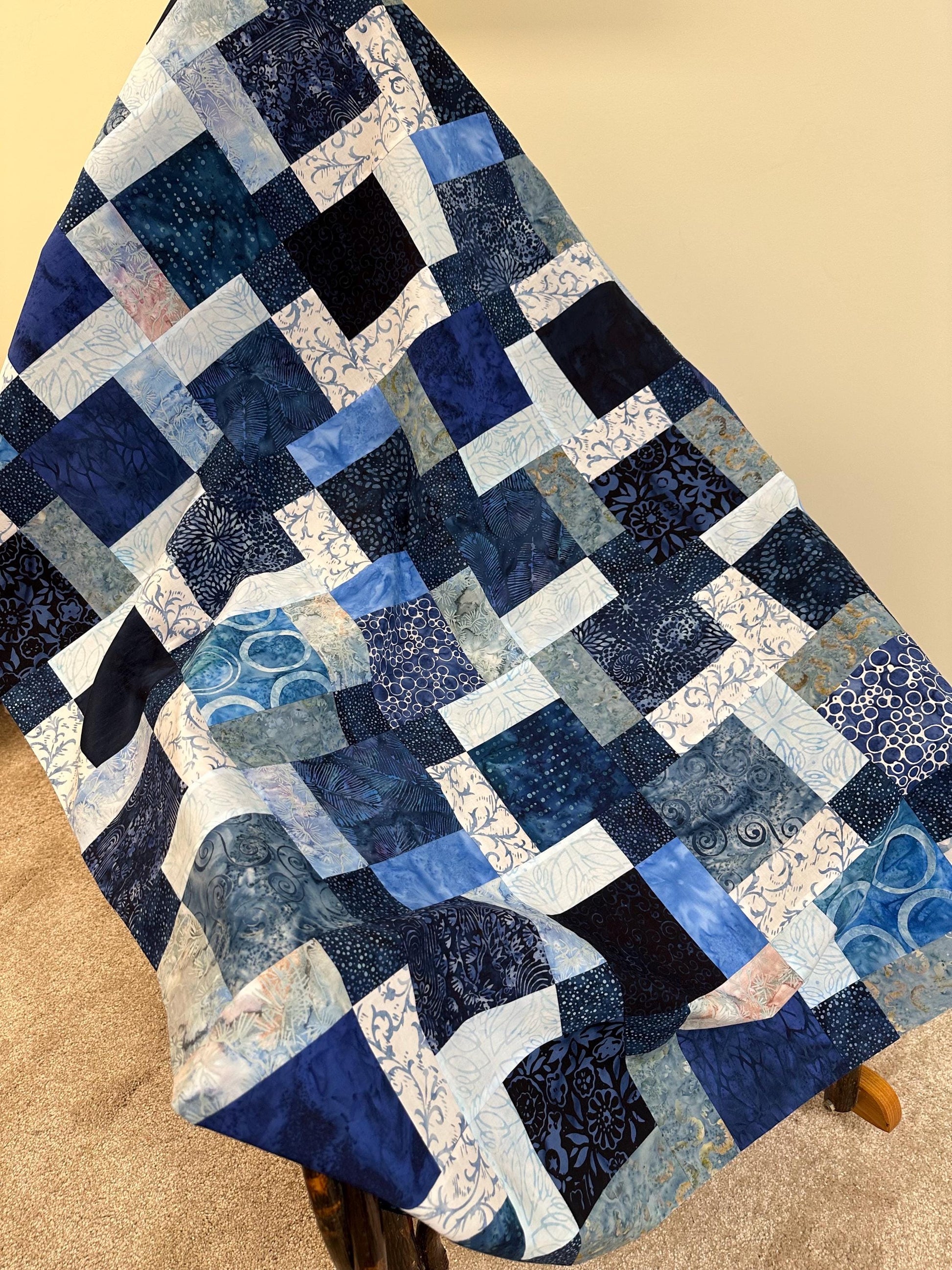 Adorn your space with this handmade batik unfinished quilt top (45" x 58" lap or throw size). Each unique patch has varying shades of blues. Intricate batik designs add a touch of artistic flair to your home decor. This 100% cotton quilt top is perfect for those who enjoy quilting and crafting their own creations.