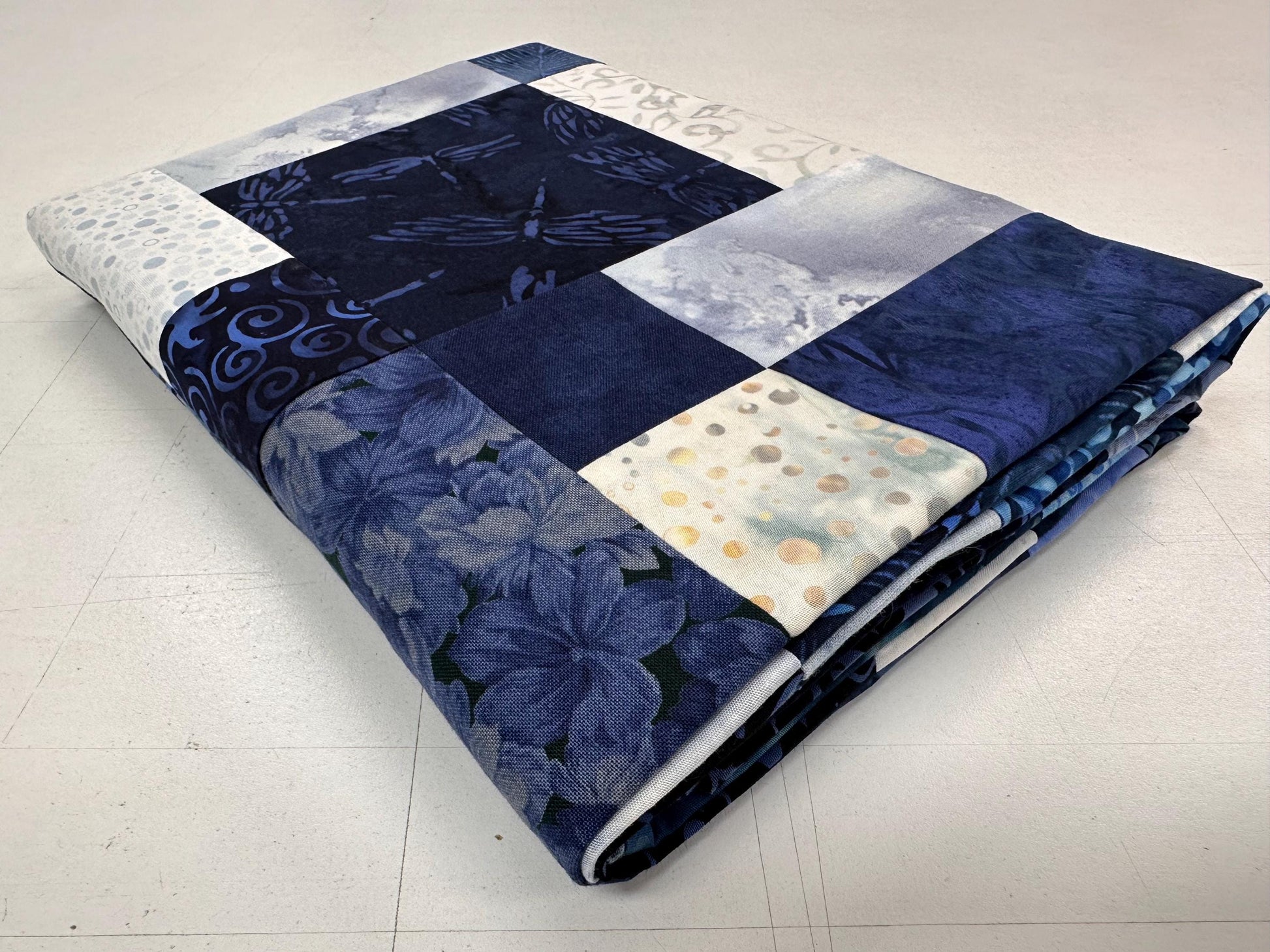 Adorn your space with this handmade batik unfinished quilt top (45" x 58" lap or throw size). Each unique patch has varying shades of blues. Intricate batik designs add a touch of artistic flair to your home decor. This 100% cotton quilt top is perfect for those who enjoy quilting and crafting their own creations.