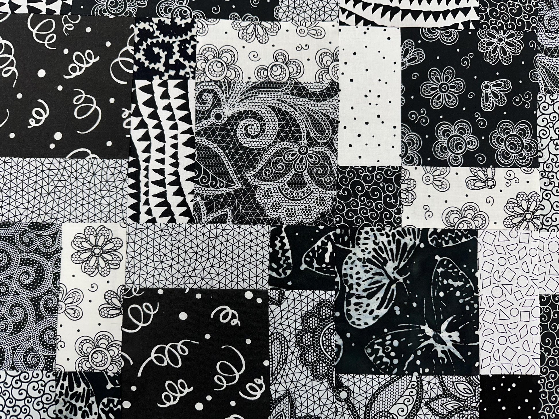 Size: The lap size quilt top measures 45" x 58" as shown. It is machine stitched and made with many different brand name quilt shop quality prints in black and white.