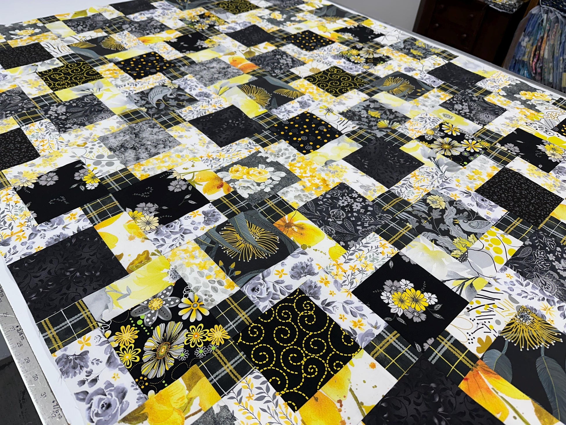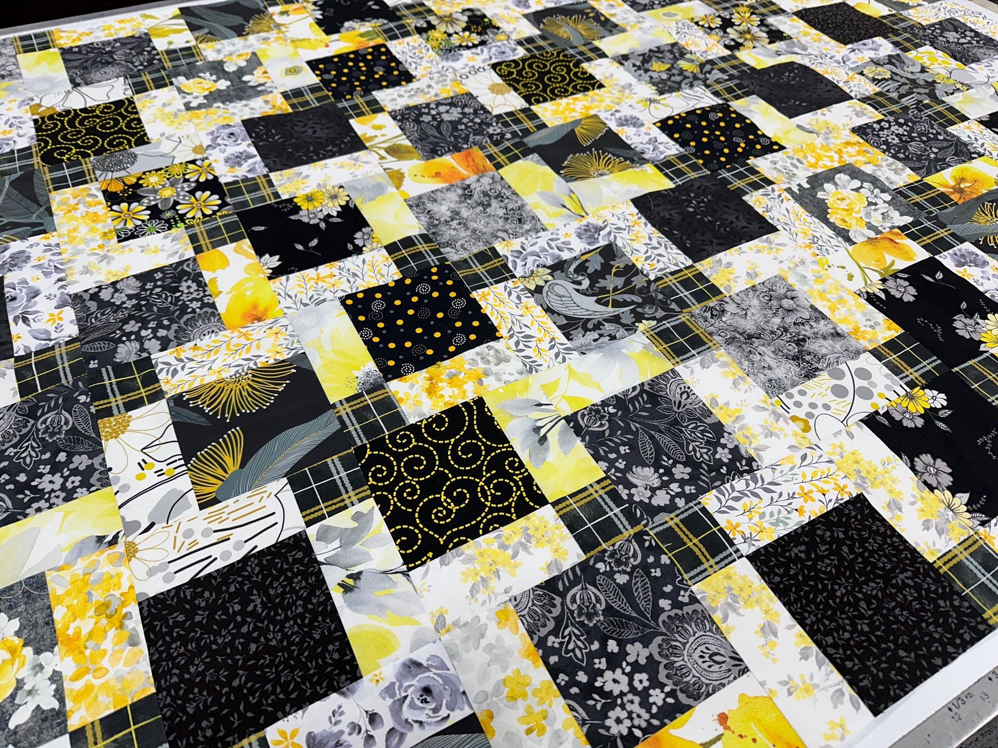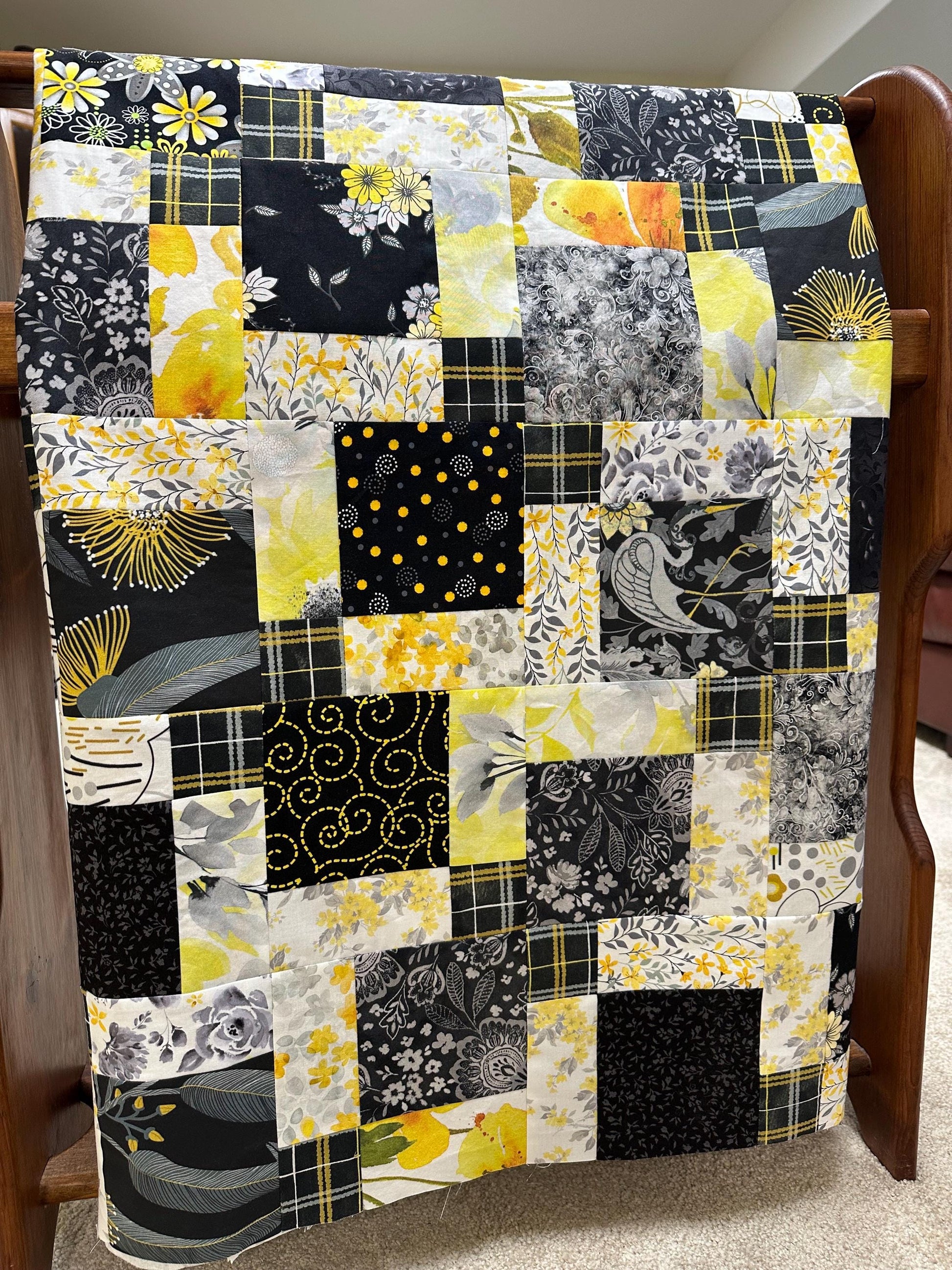 A beautiful new handmade unfinished quilt top (lap size) made of quilt shop quality 100% cotton fabrics in shades of black, gray, yellow, and white. The bold colors of the modern quilt top remind me of an elegant chic living room. Bring a piece of handmade into your modern contemporary home.