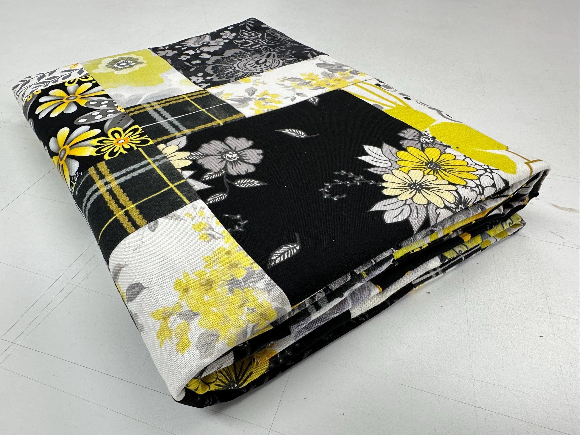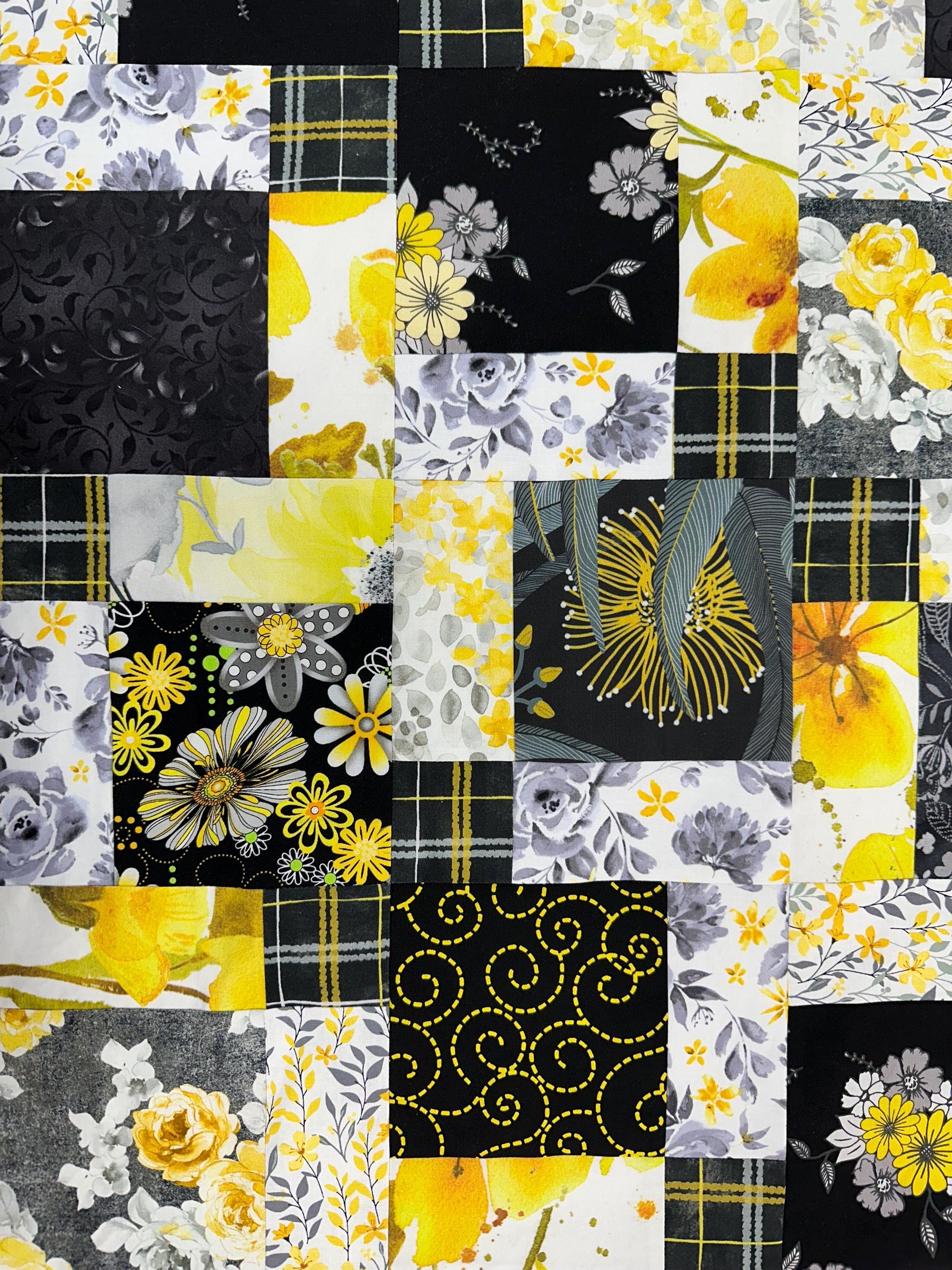 Handmade Black Gray Yellow Floral Quilt Top: Lap Quilt (45" x 58")