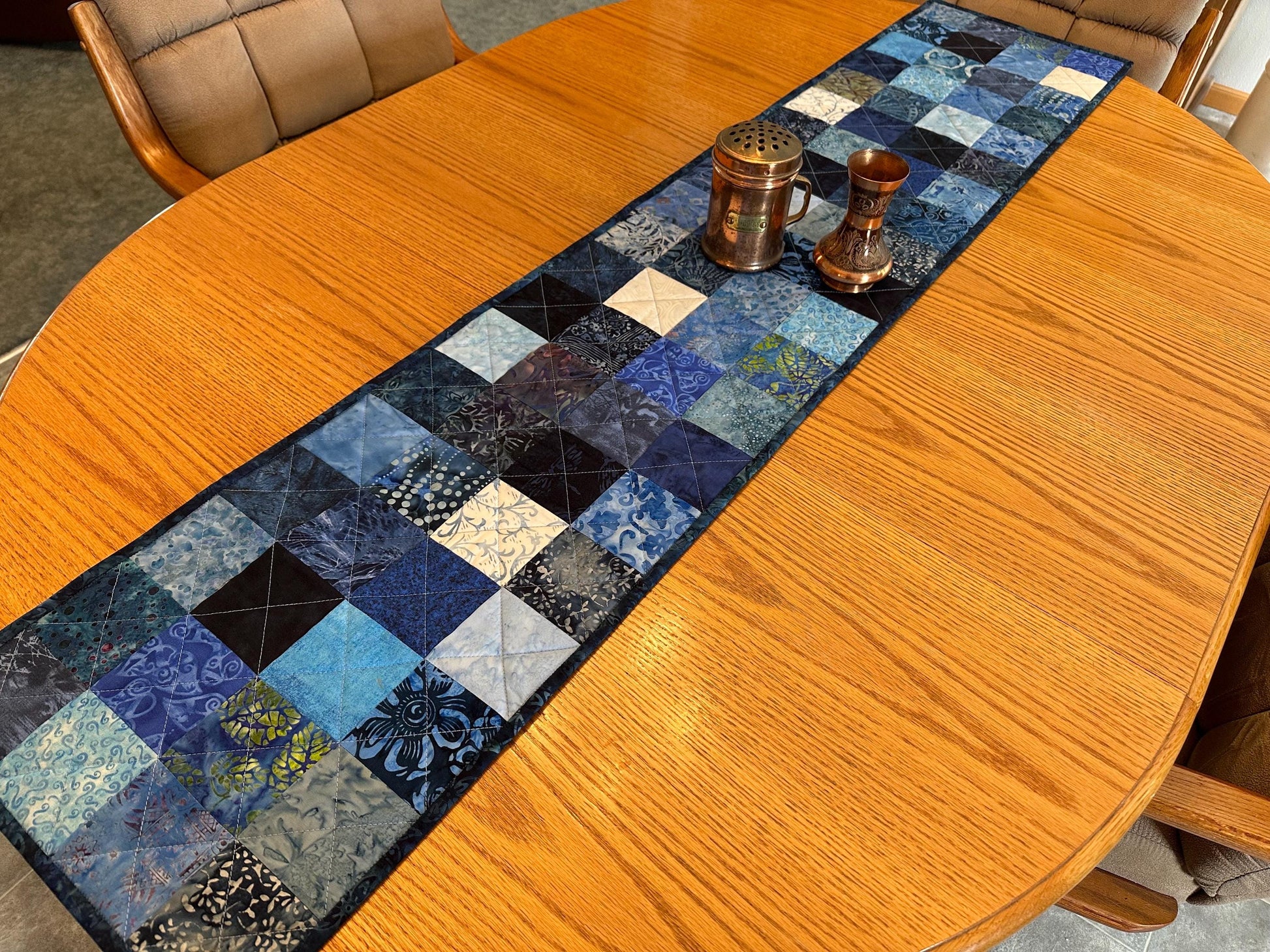 Handmade Blue Batik Table Runner: 13x61 Quilted Centerpiece for Kitchen, Housewarming, Bridal Shower