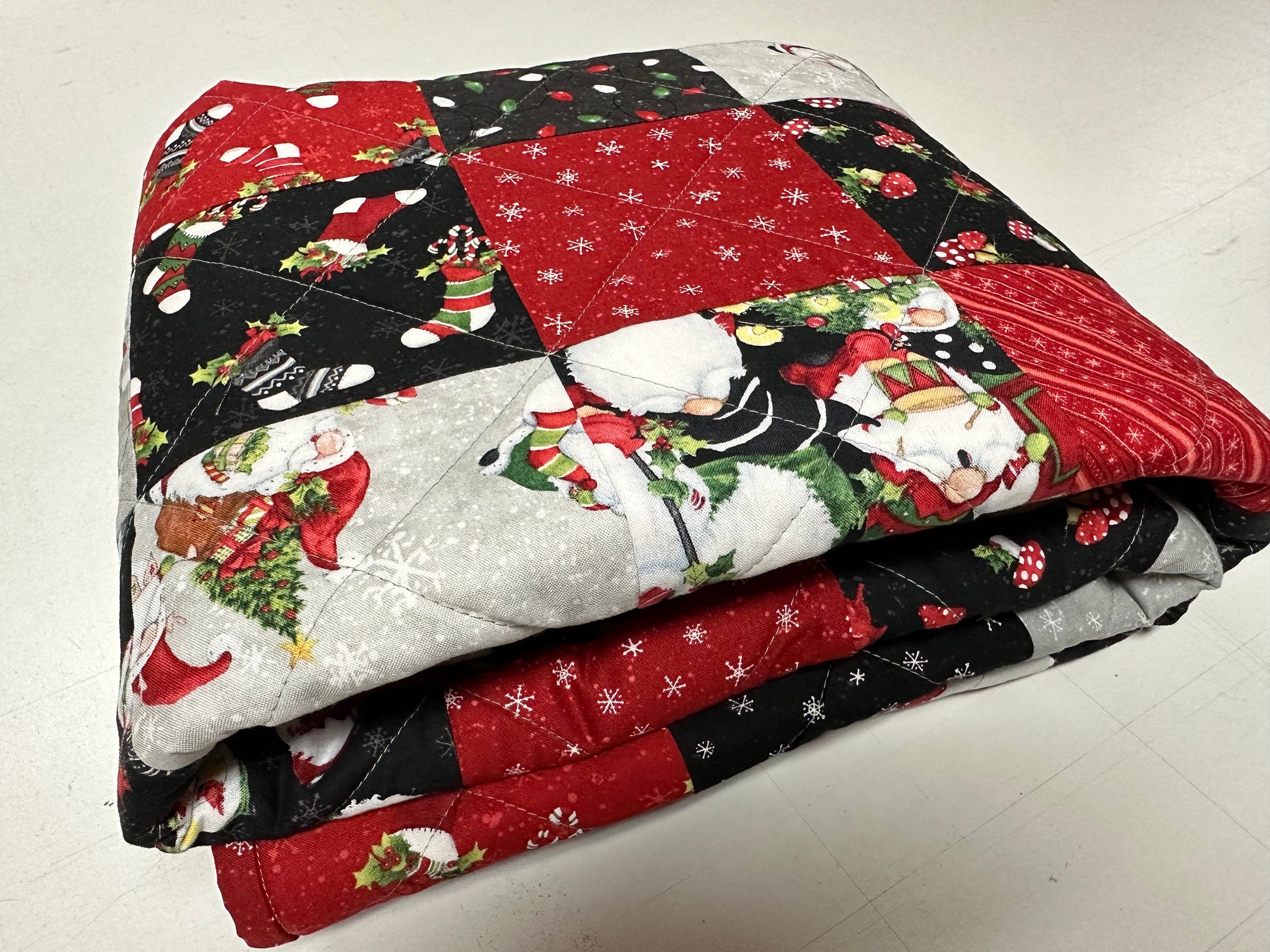 Whimsical Christmas gnomes adorn the handmade Christmas quilt (lap size - 55" x 64"). The blocks have a variety of Christmas gnomes, mushrooms, snowflakes, lights, and stockings. Color are reds, black, grays, and greens. The great thing about a Christmas quilt is you will enjoy it for many years to come. It also makes a great gift for anyone who loves to decorate for the season.