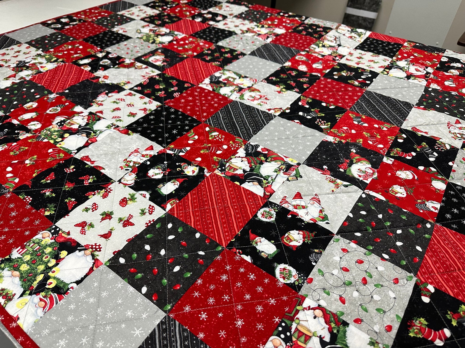 Backing and Binding: The backing fabric is an allover Christmas gnomes pattern with a coordinating red snowflake binding.