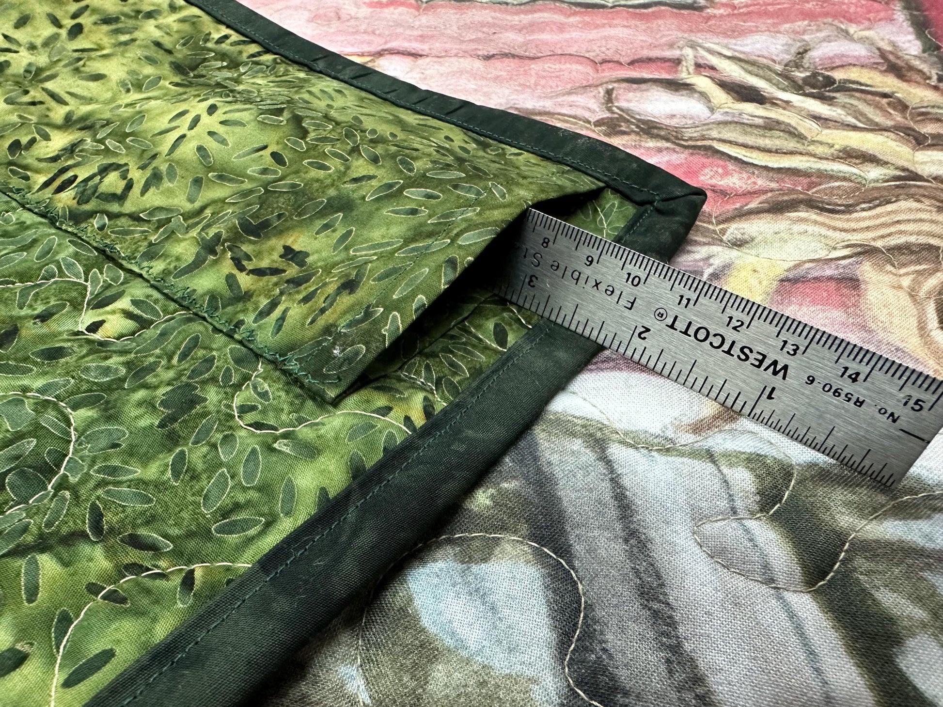This fabric wall hanging uses Hobbs 80/20 batting and is machine quilted by me with a meandering all over design.