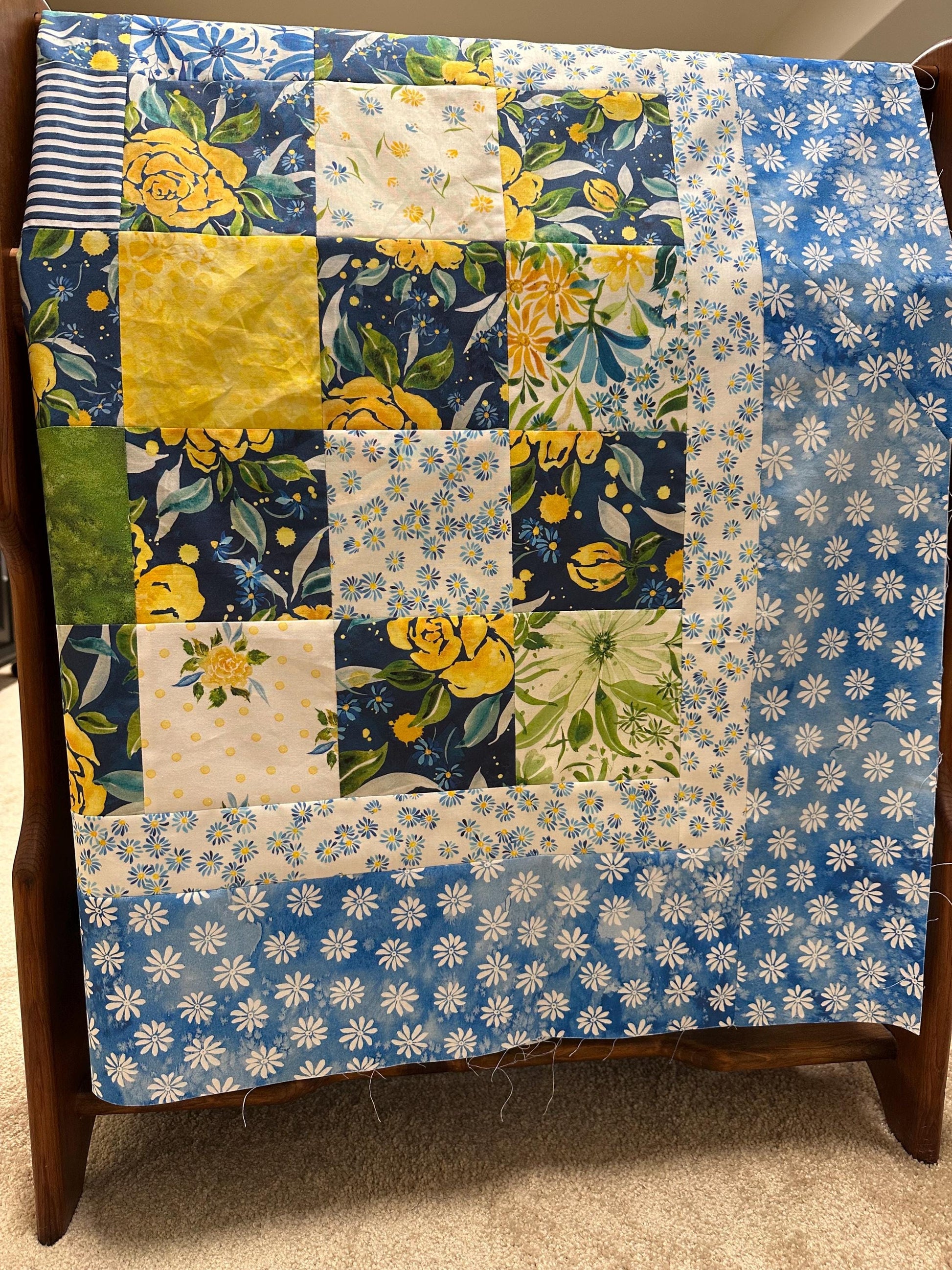 A beautiful new handmade unfinished quilt top (lap size) made of quilt shop quality 100% cotton fabrics in striking blue, yellow, and green florals and prints. If you enjoy a bold floral and foliage look this is a great line of fabrics.
