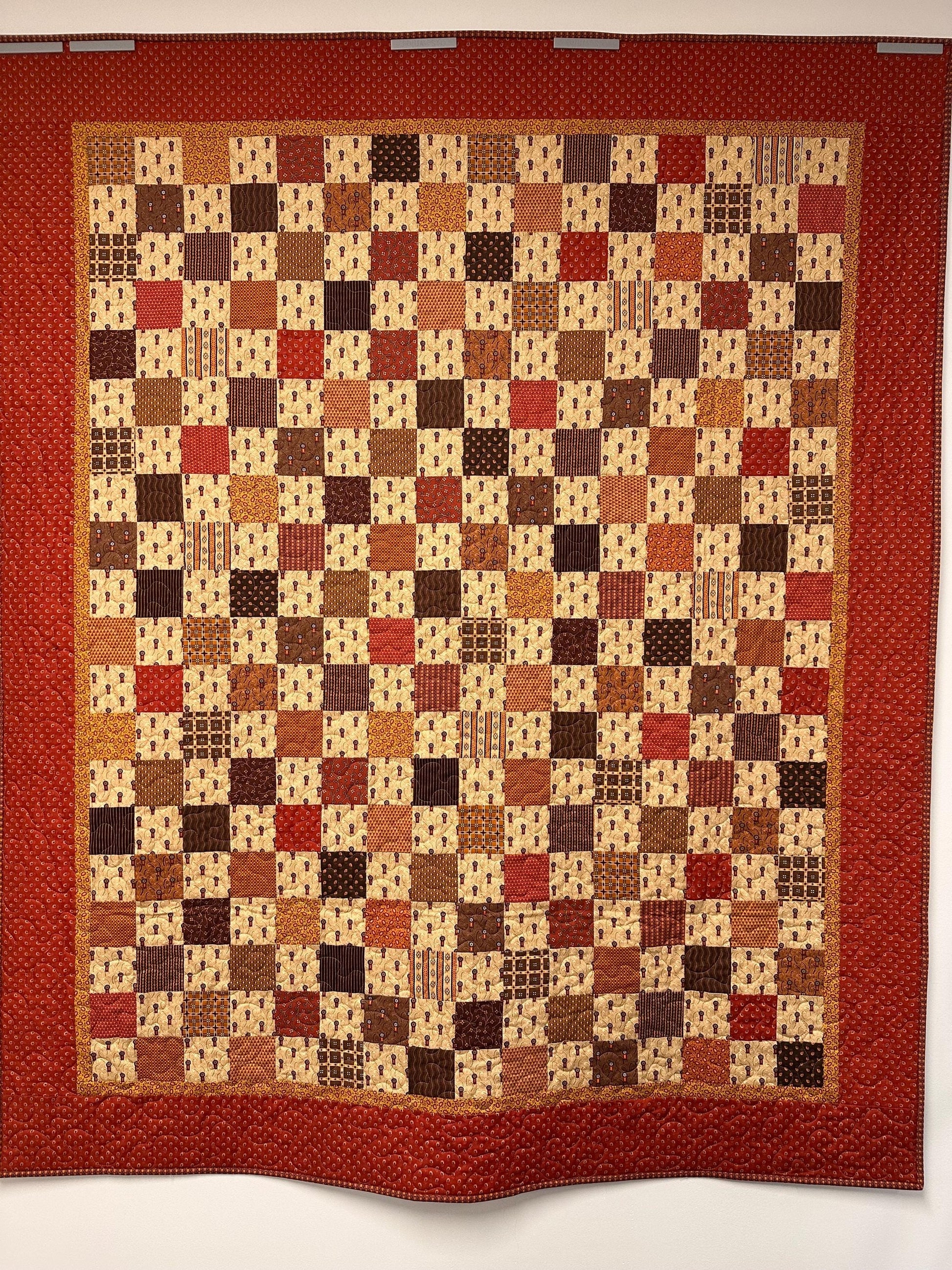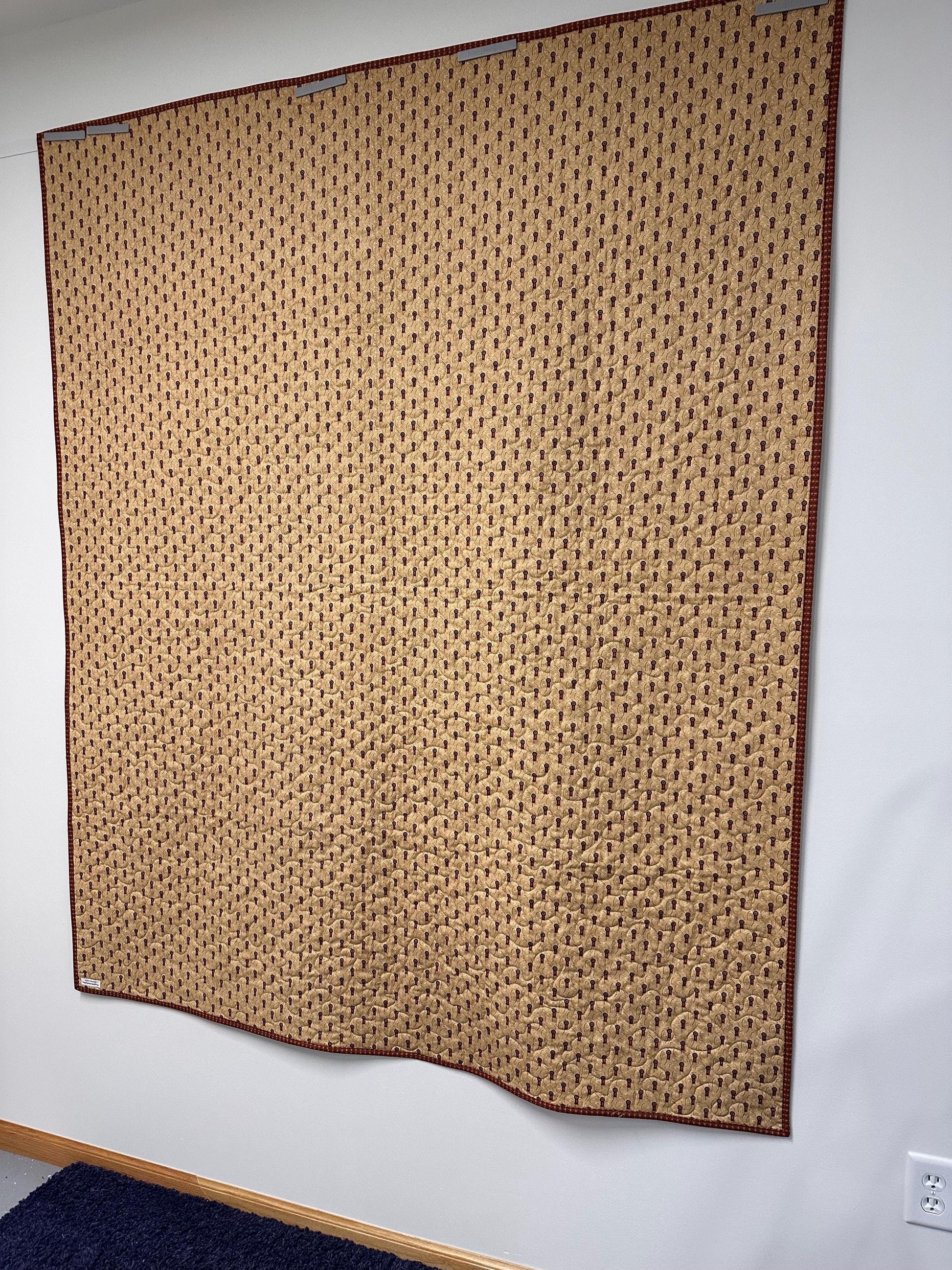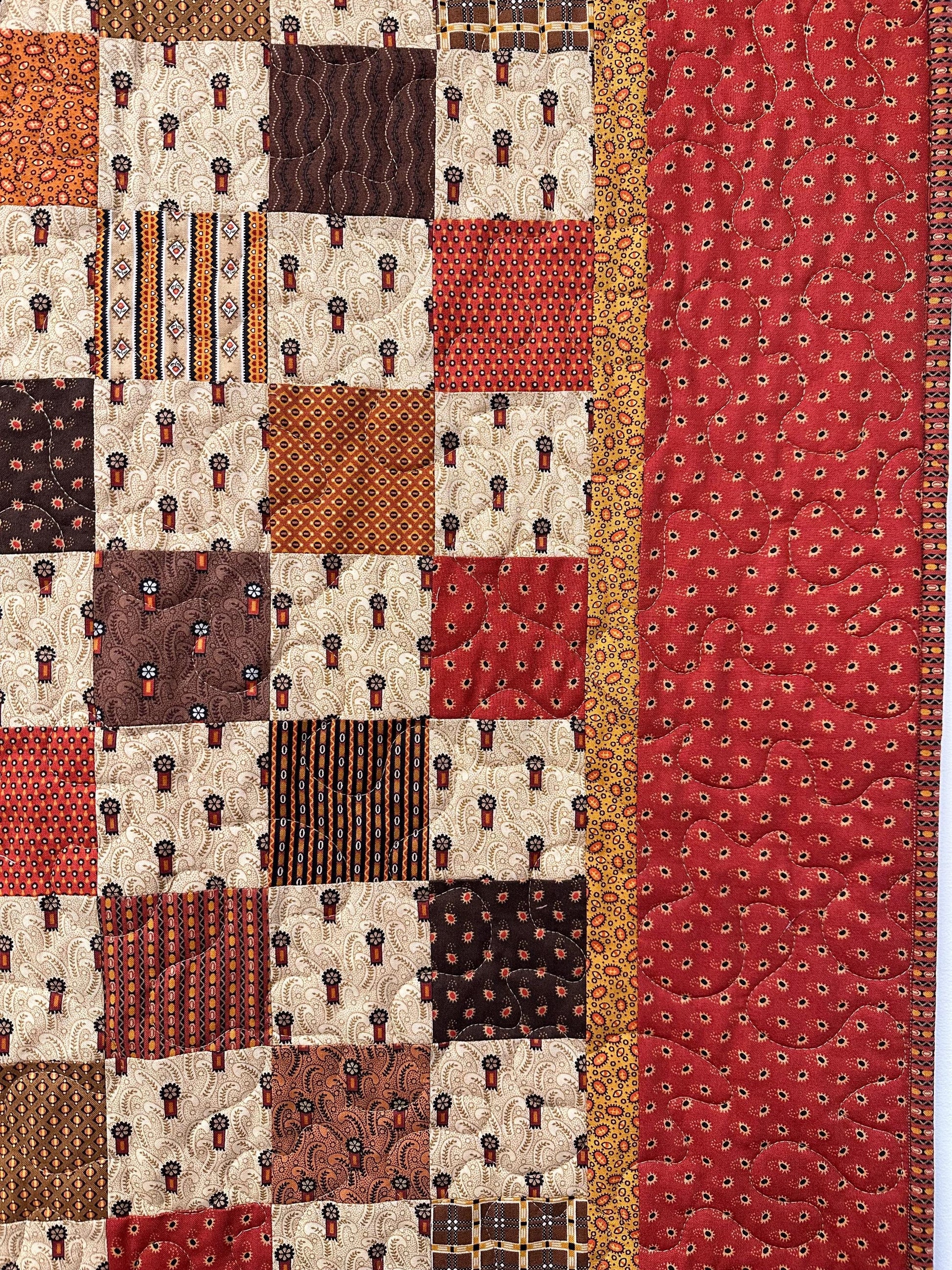Quilting: This lap quilt is machine stitched and quilted with an overall meandering pattern using tan thread.