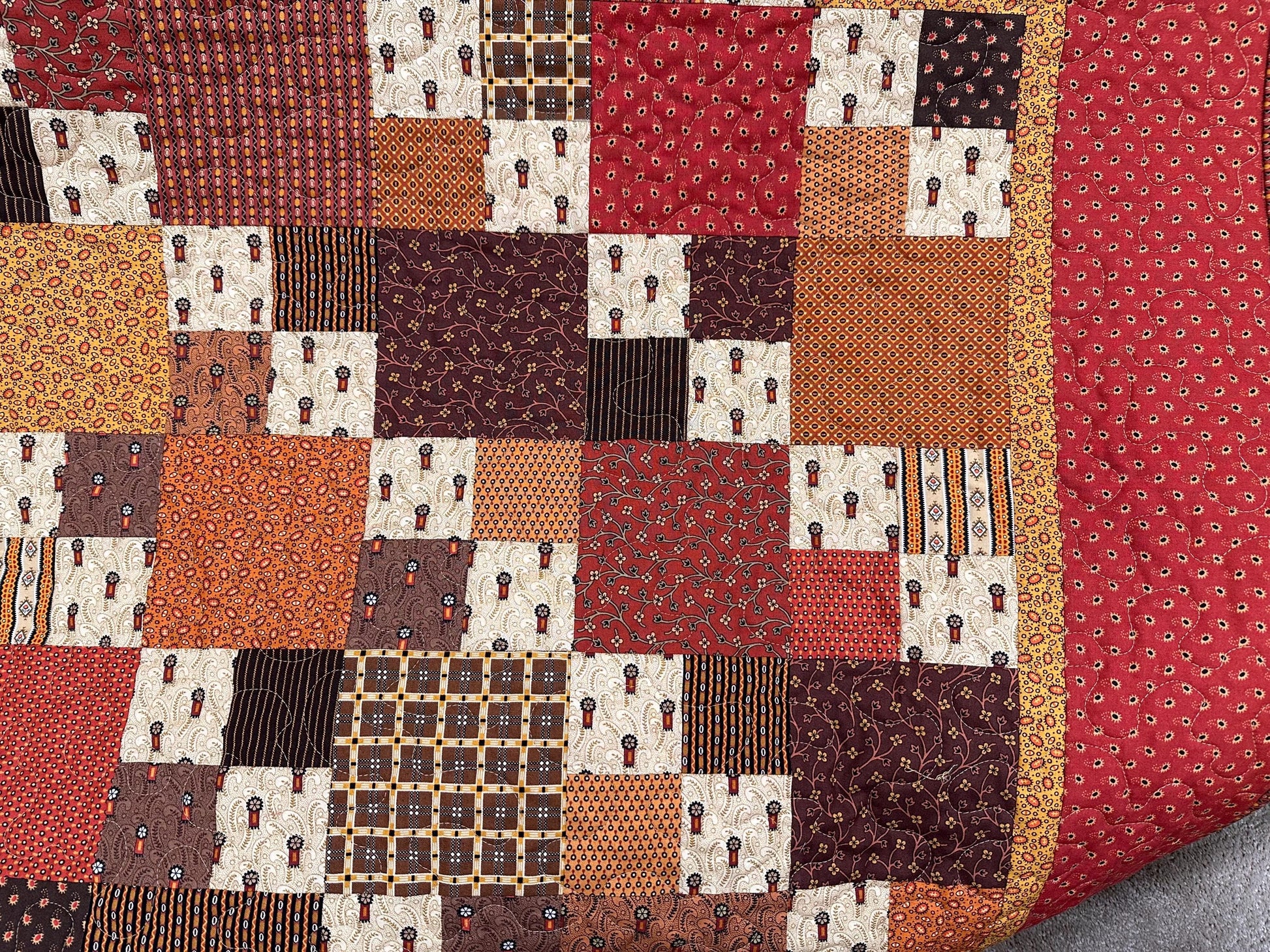 Borders and Backing: The inner border is a mustard yellow stylized print and the outer border is a dark red and cream stylized print. The backing fabric is a tan-beige color with stylized flowers and paisley design.