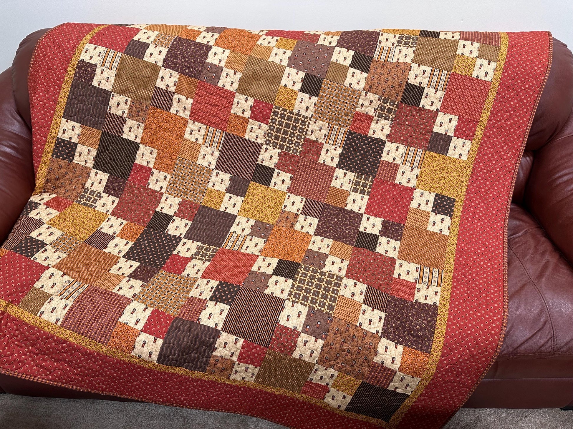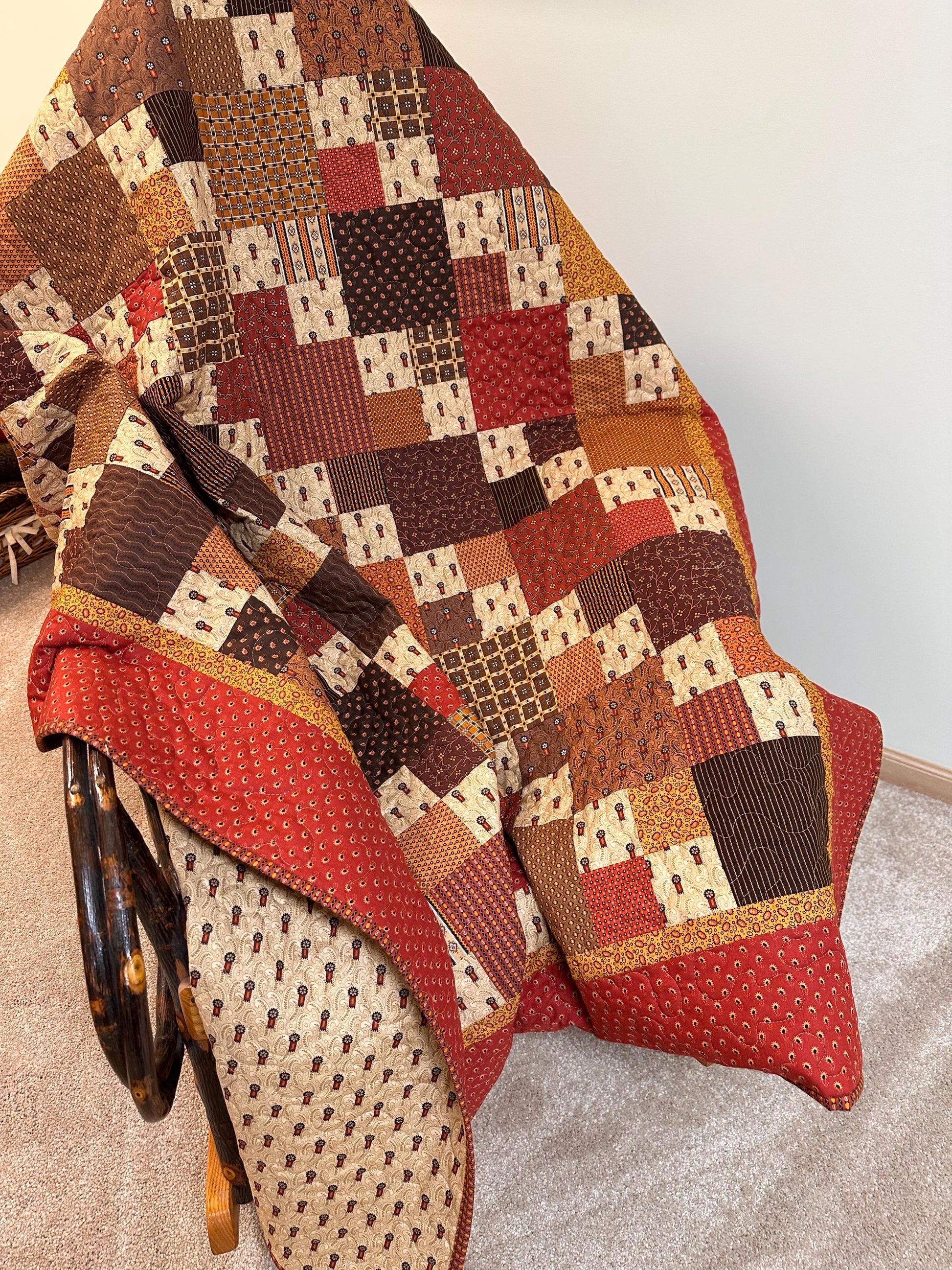 Cozy up with this new handmade patchwork sofa throw size quilt (62" x 72"). It is made of 100% cotton fabrics in shades of rich browns, tans, and oranges. This modern quilt is finished and ready to ship to you the next business day.