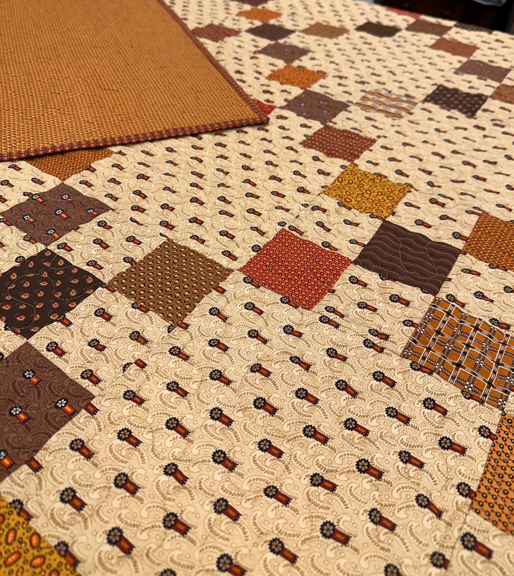 Cozy up with this new handmade patchwork sofa throw size quilt (65" x 74"). It is made of 100% cotton fabrics in shades of rich browns, tans, and oranges . This modern quilt is finished and ready to ship to you the next business day.
