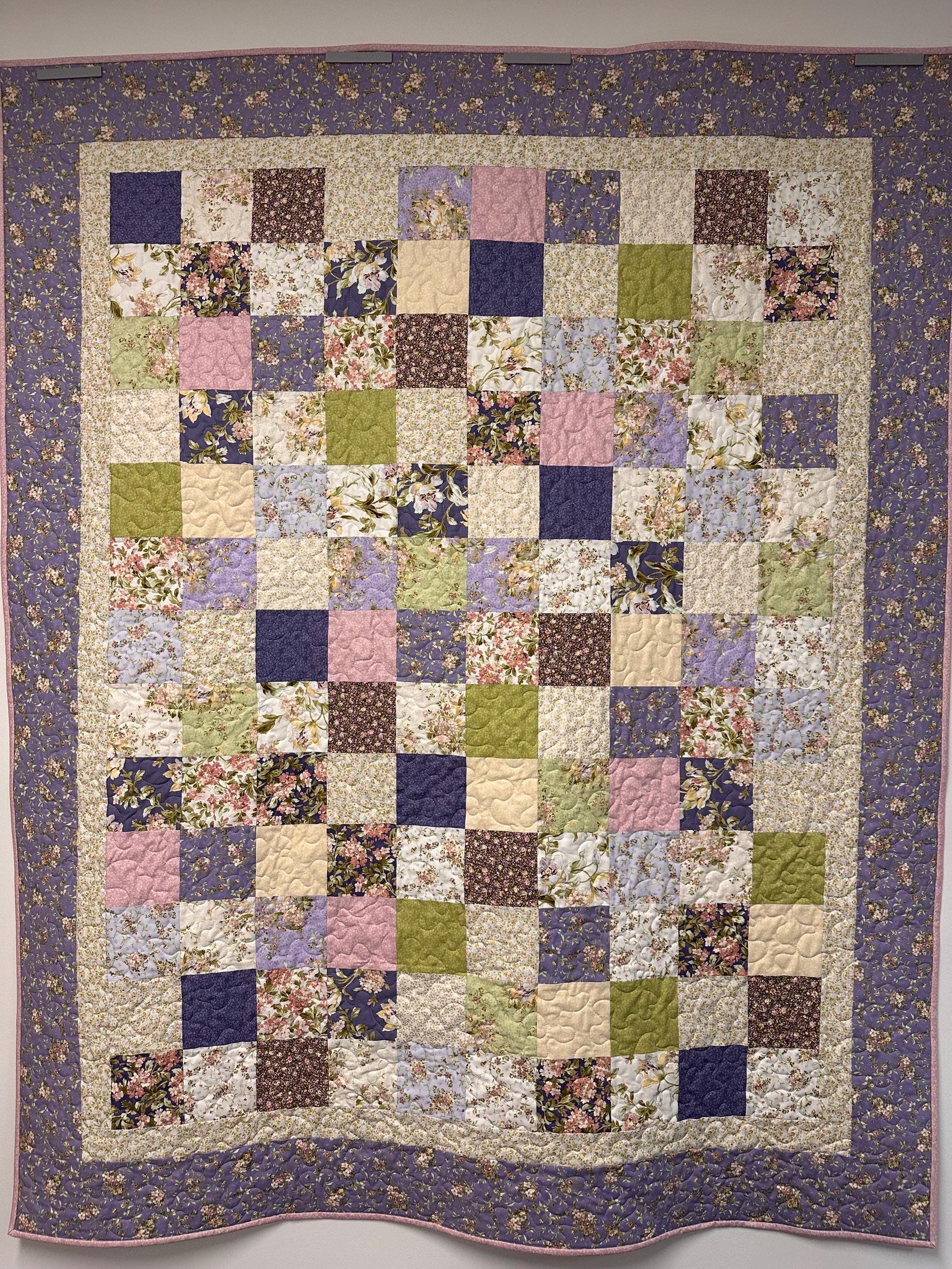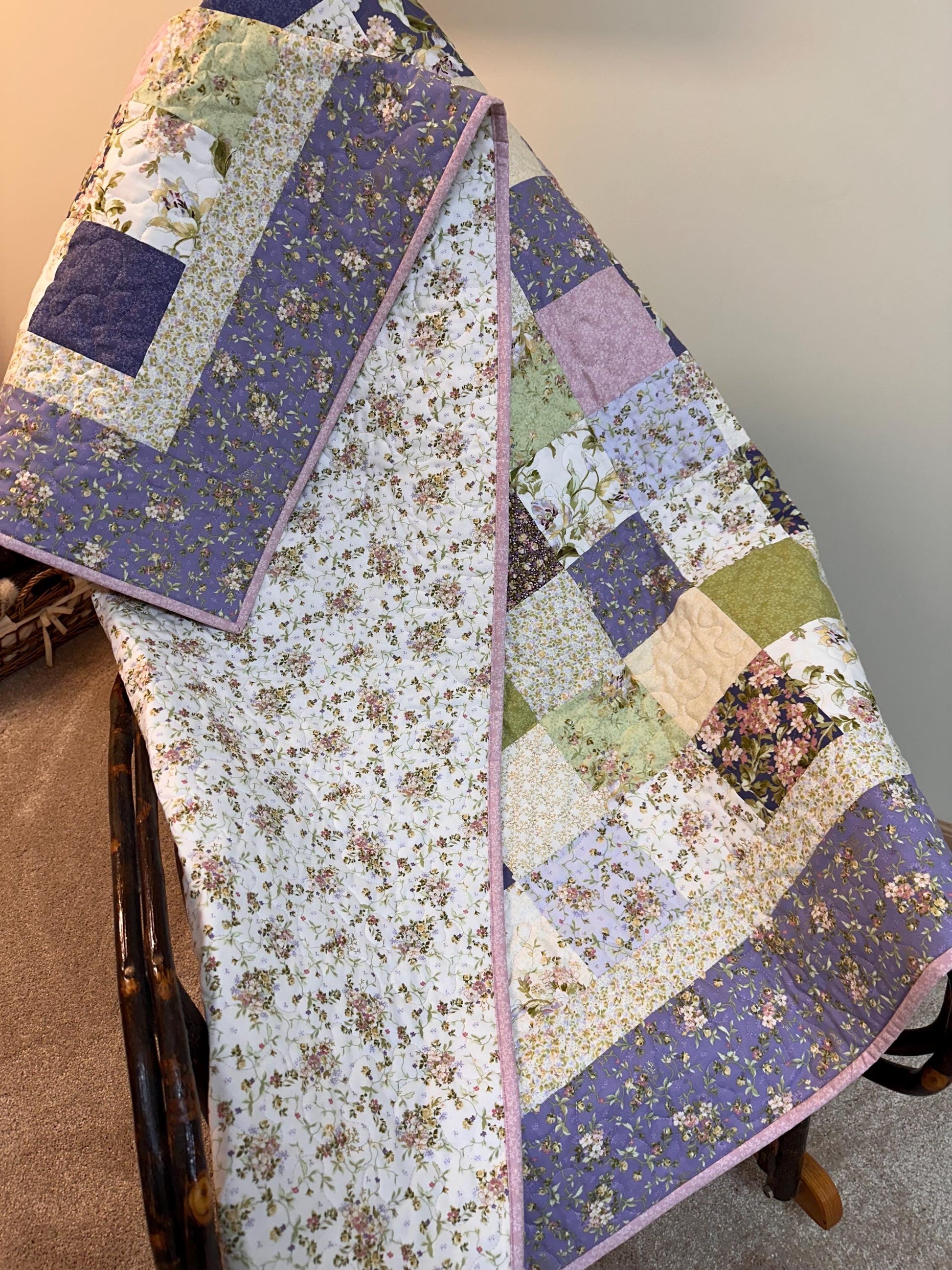 Add grace and elegance to your home with this new handmade patchwork quilt (59" x 72" sofa throw size). It is made of 100% cotton fabrics in shades of soft purples, creams, greens, and purples. This modern quilt is finished and ready to ship to you the next business day.