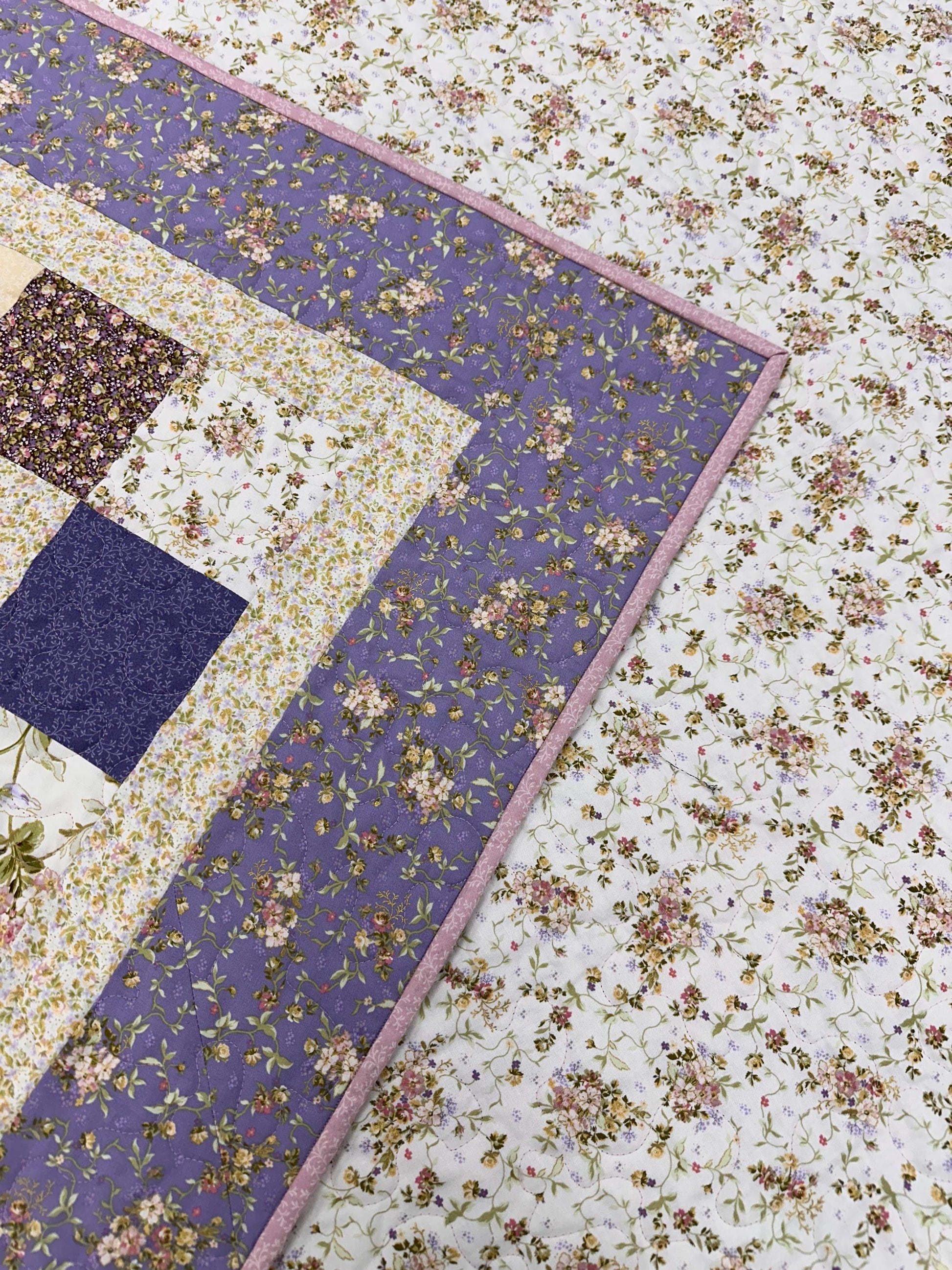 Borders and Backing: The inner border is a cream floral and the outer border is a purple scattered bouquet floral print. The backing fabric is a white allover floral.