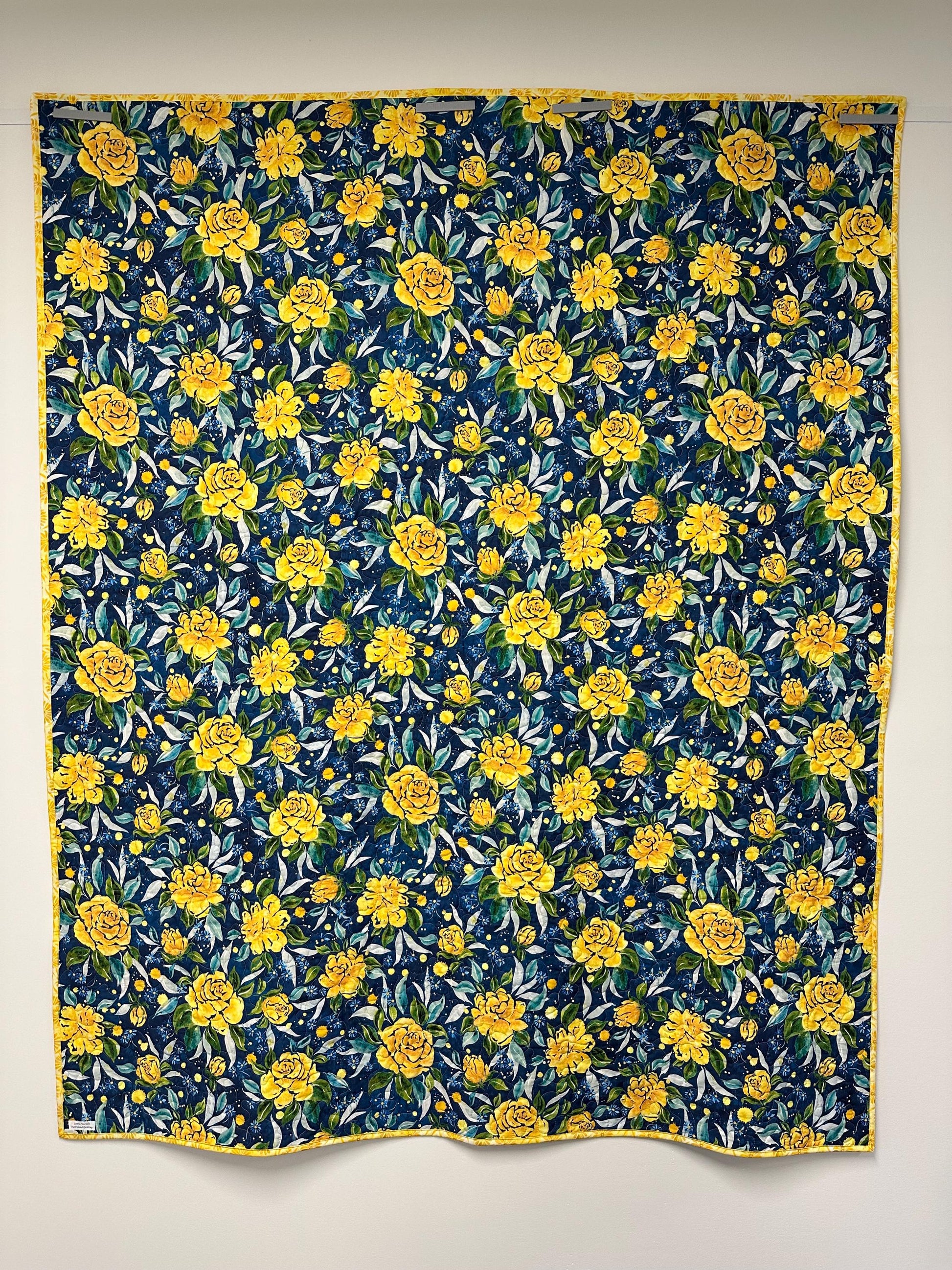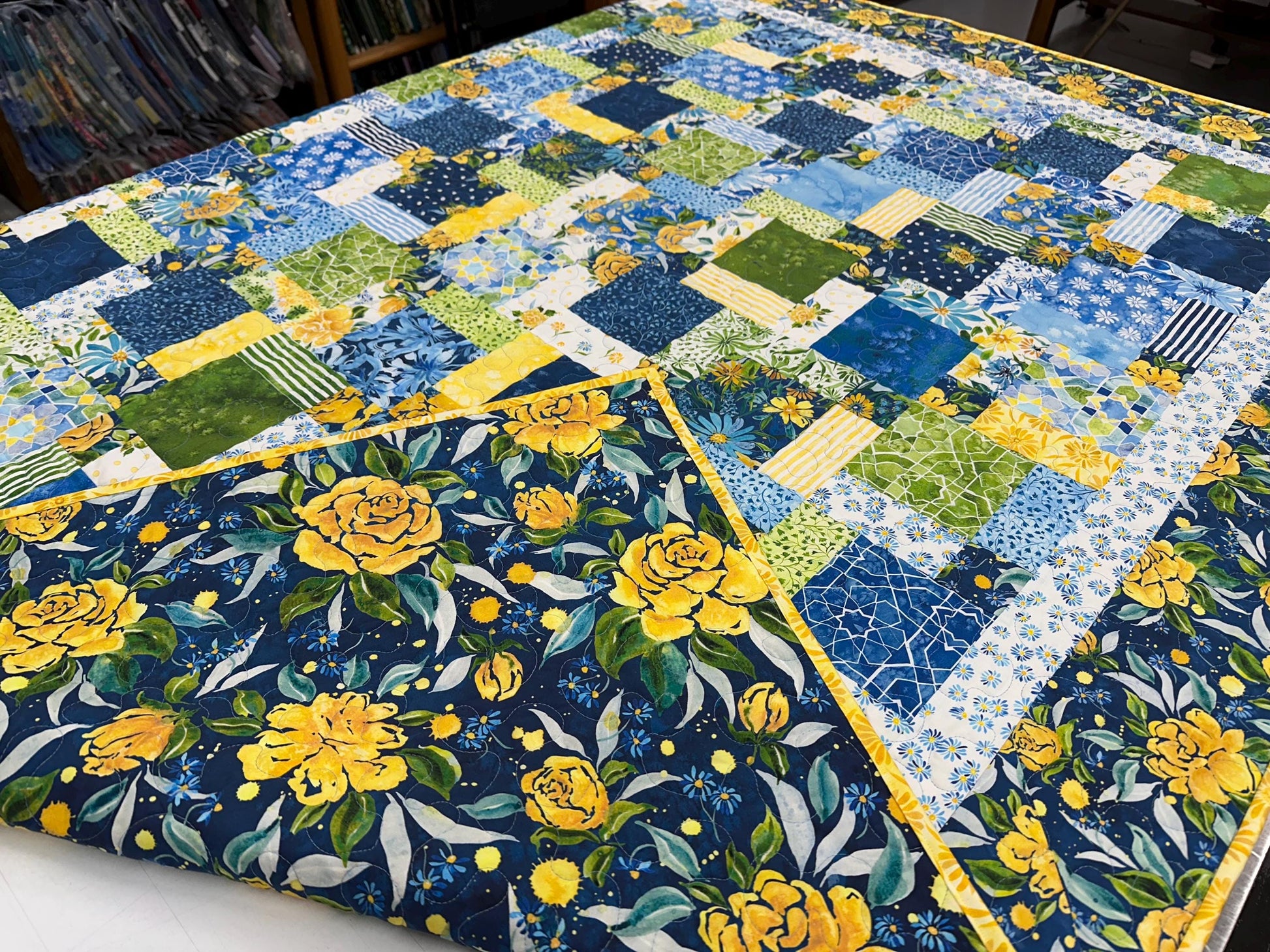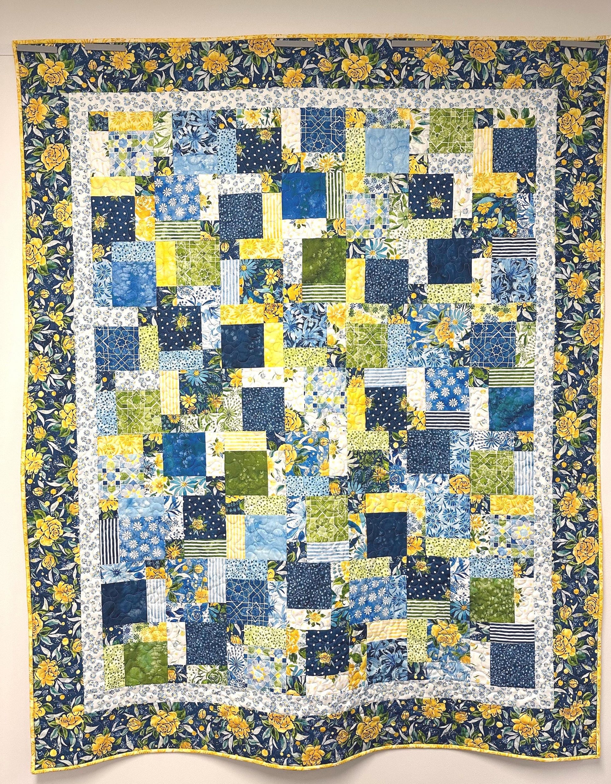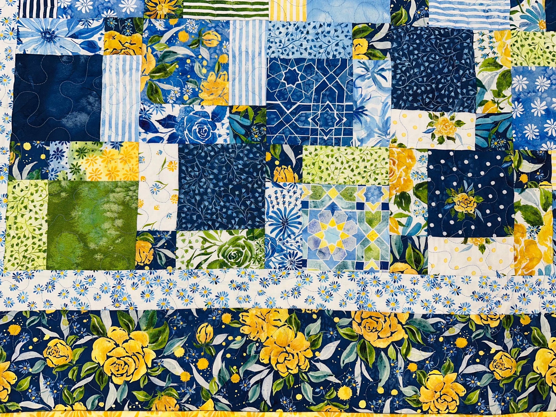 Borders and Backing: The inner border is a white floral and the outer border is a blue and yellow floral print. The backing fabric is a larger blue and yellow floral print.