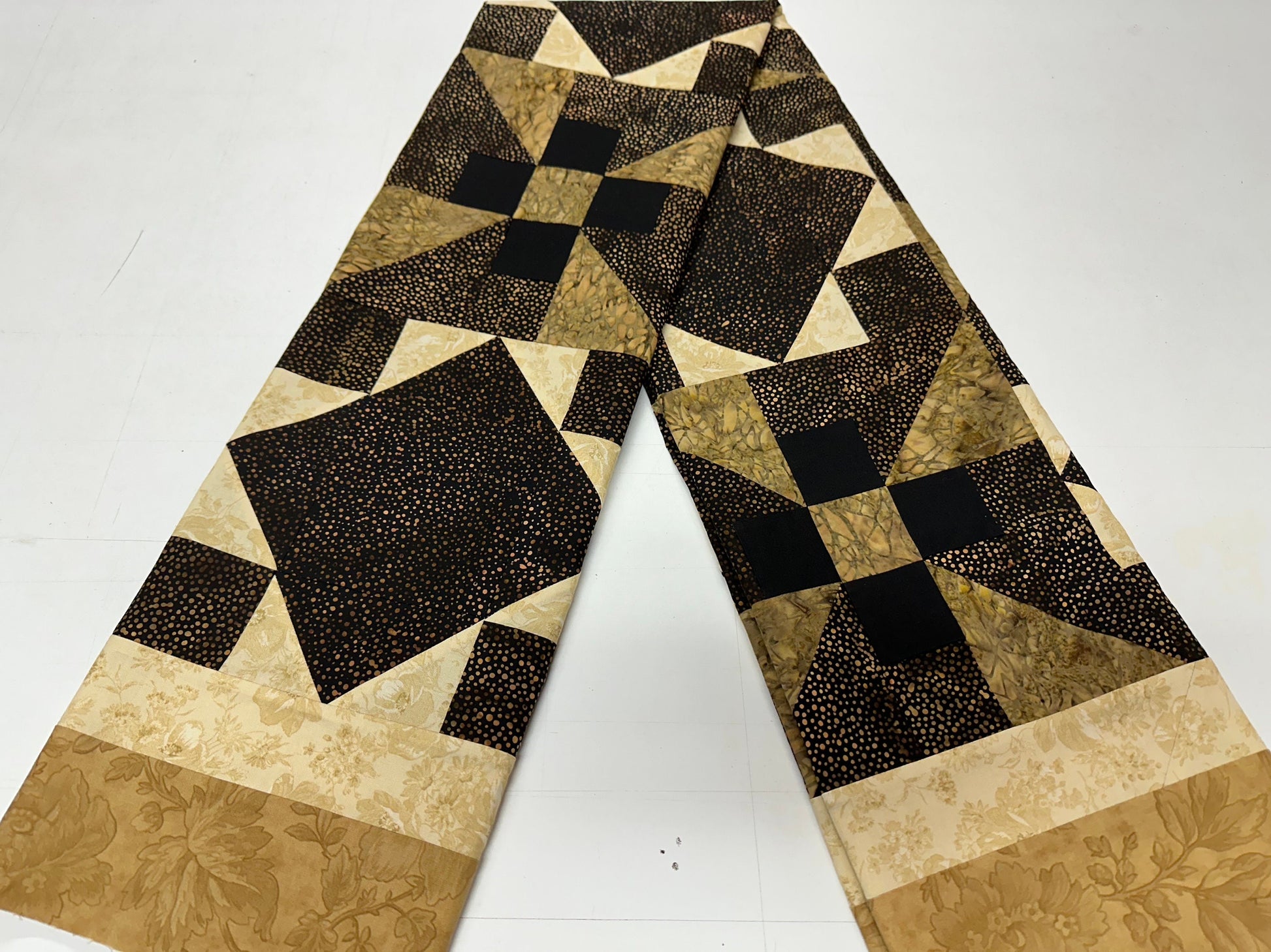 A beautiful new handmade unfinished quilt top (60" x 70" large sofa throw size) made of quilt shop quality 100% cotton batik and floral prints in shades of blacks, browns, tans, and creams. The colors remind me of a chic modern styled home. Bring a piece of handmade into your contemporary home.