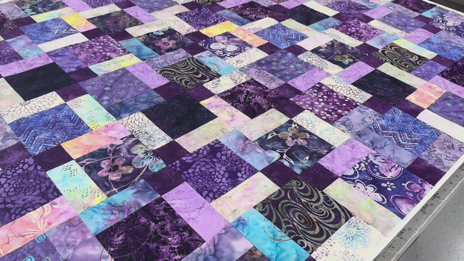Each unique patch in varying shades of purple and intricate batik designs adds a touch of artistic flair to your home decor. This quilt top is perfect for those who enjoy quilting and crafting their own creations.