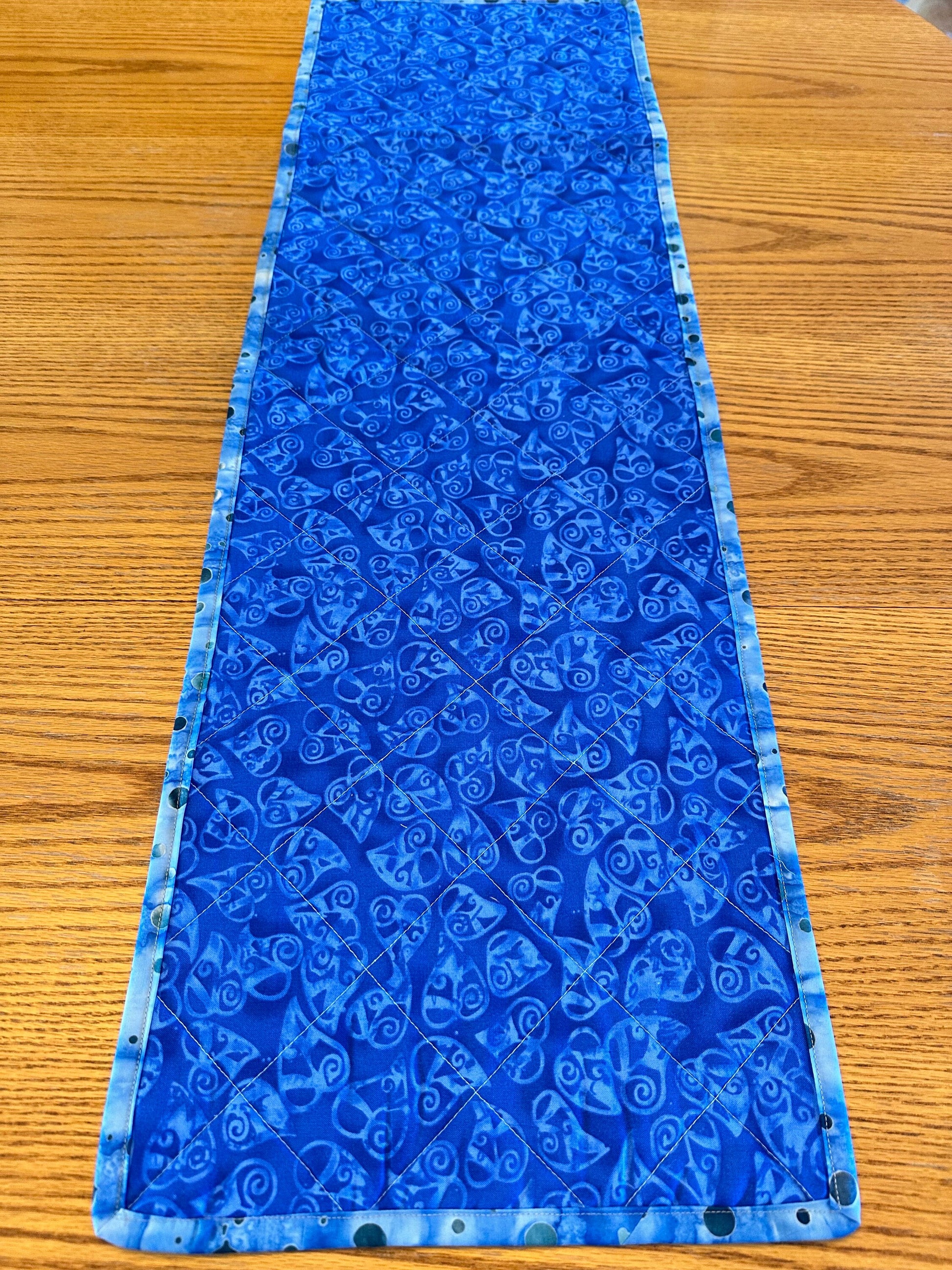 The border and backing is a beautiful blue batik with a coordinating binding. It is machine pieced and quilted.