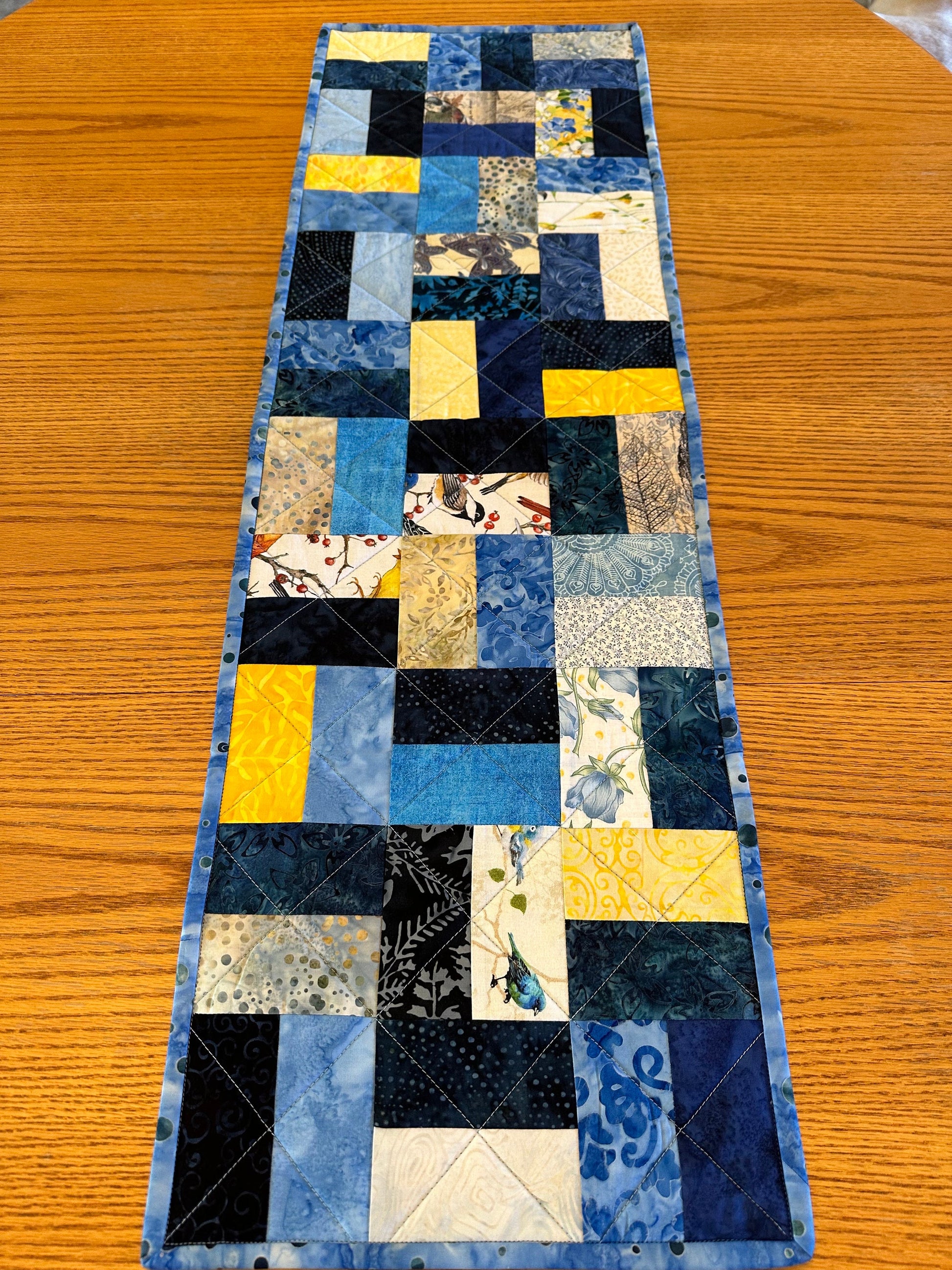 Handmade Quilted Table Runner: Blue & Yellow Spring Fall Kitchen Decor, 12x40 Inch Farmhouse Centerpiece
