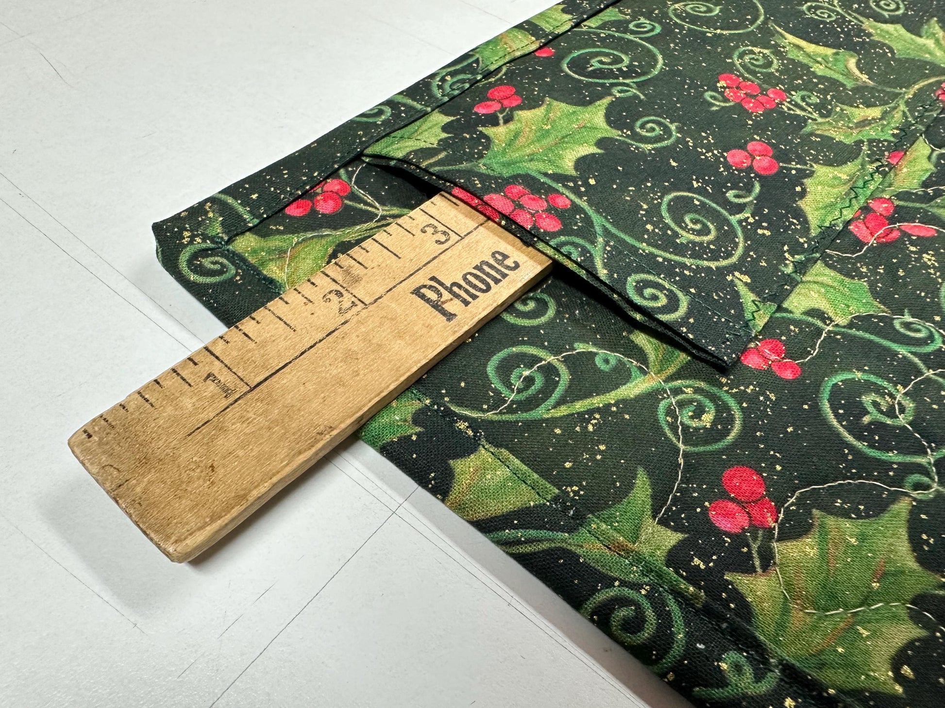 This Christmas blanket uses Hobbs 80/20 batting and is machine quilted with a tan thread and a meandering allover design.