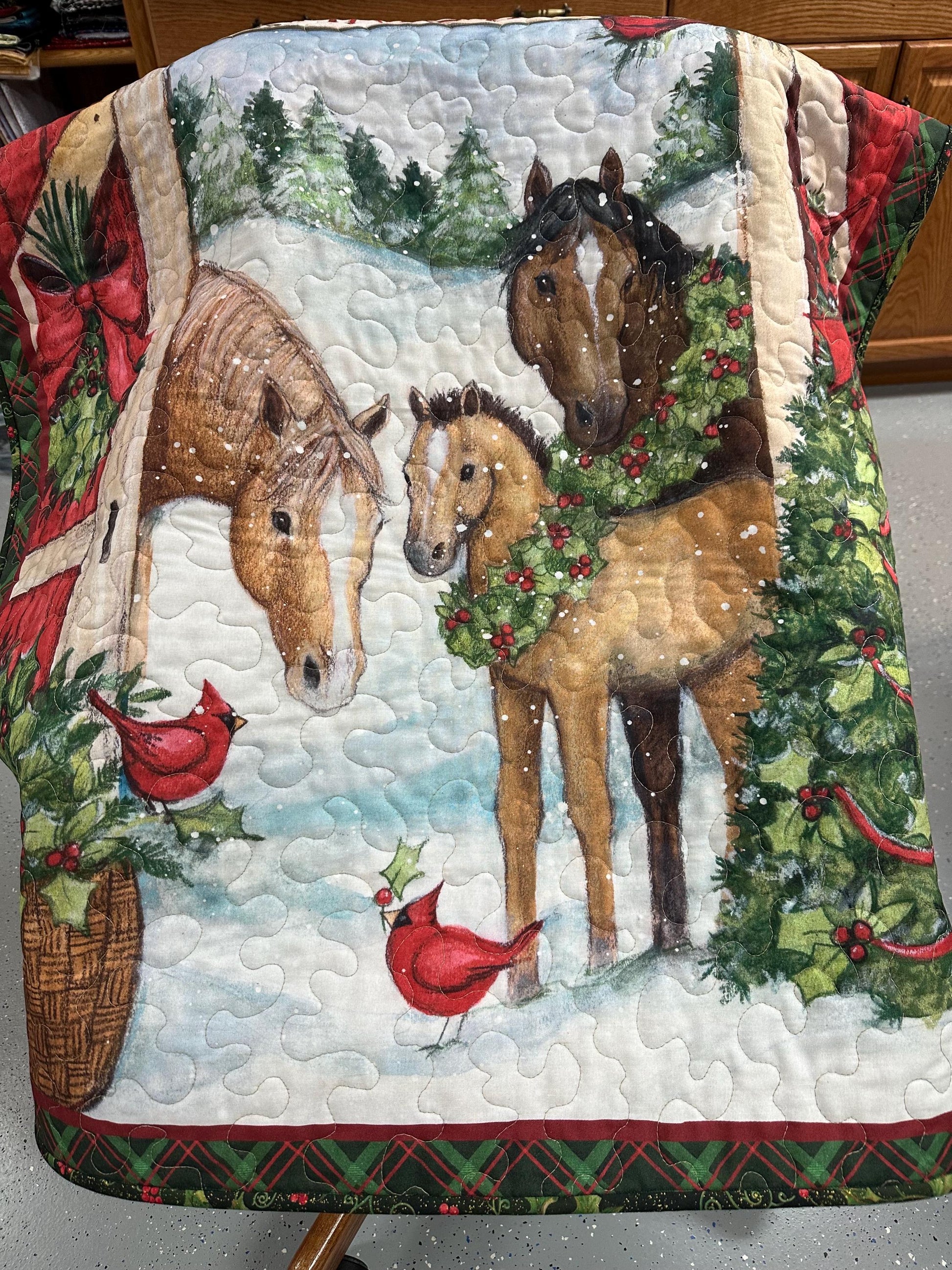 Decorate your home for the holidays with this cute Christmas quilt (35" x 42"). Hang this on a wall, balcony or drape it over a chair or couch. If you love horses or know someone who does, this makes a beautiful gift. It is also a nice addition to your Christmas home decor.