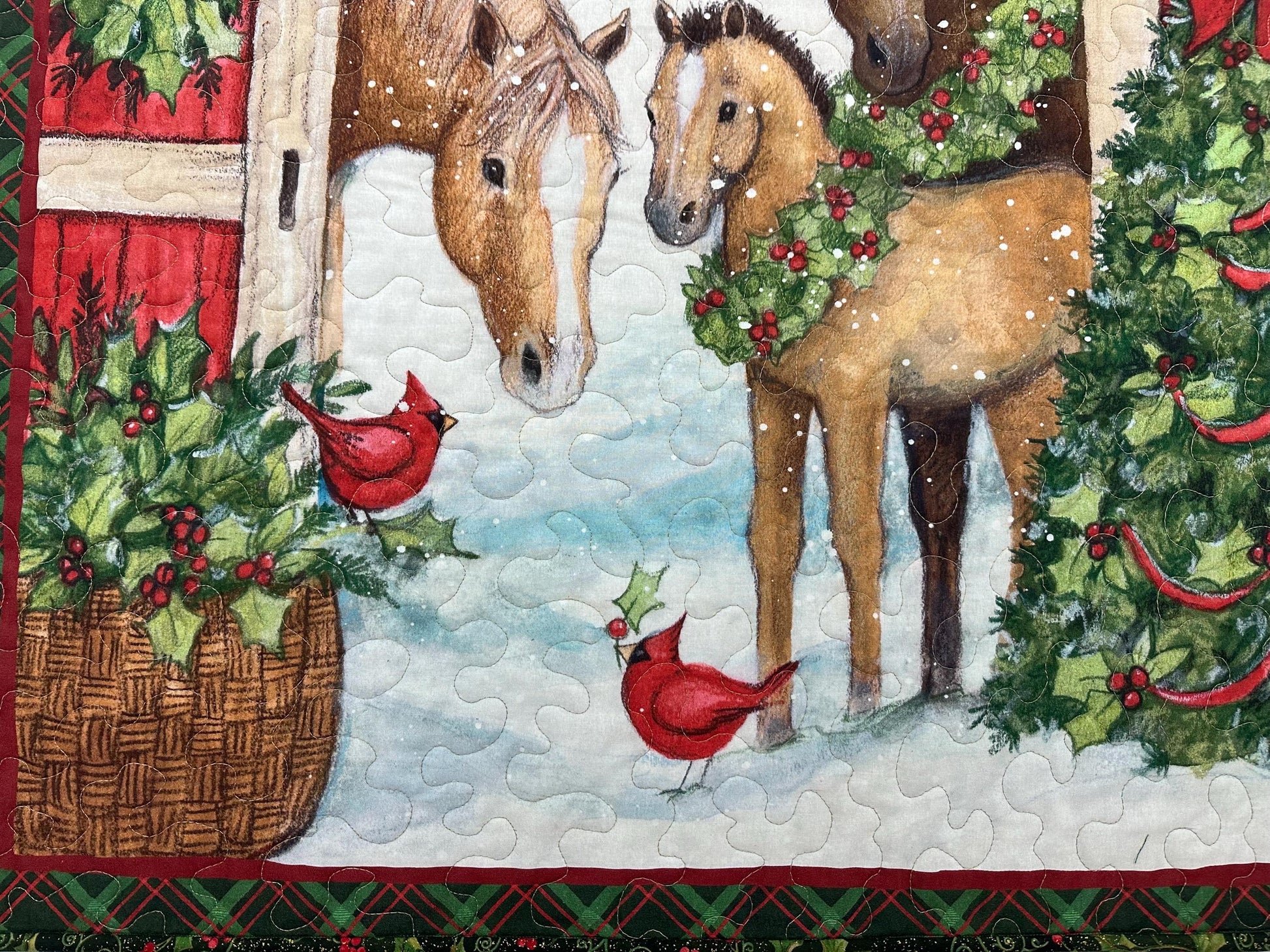 This handmade quilt has 3 horses at the barn gate with a snowy scene and cardinals. The backing fabric is a dark green Poinsettia print fabric. The quilt has a green poinsettia binding.