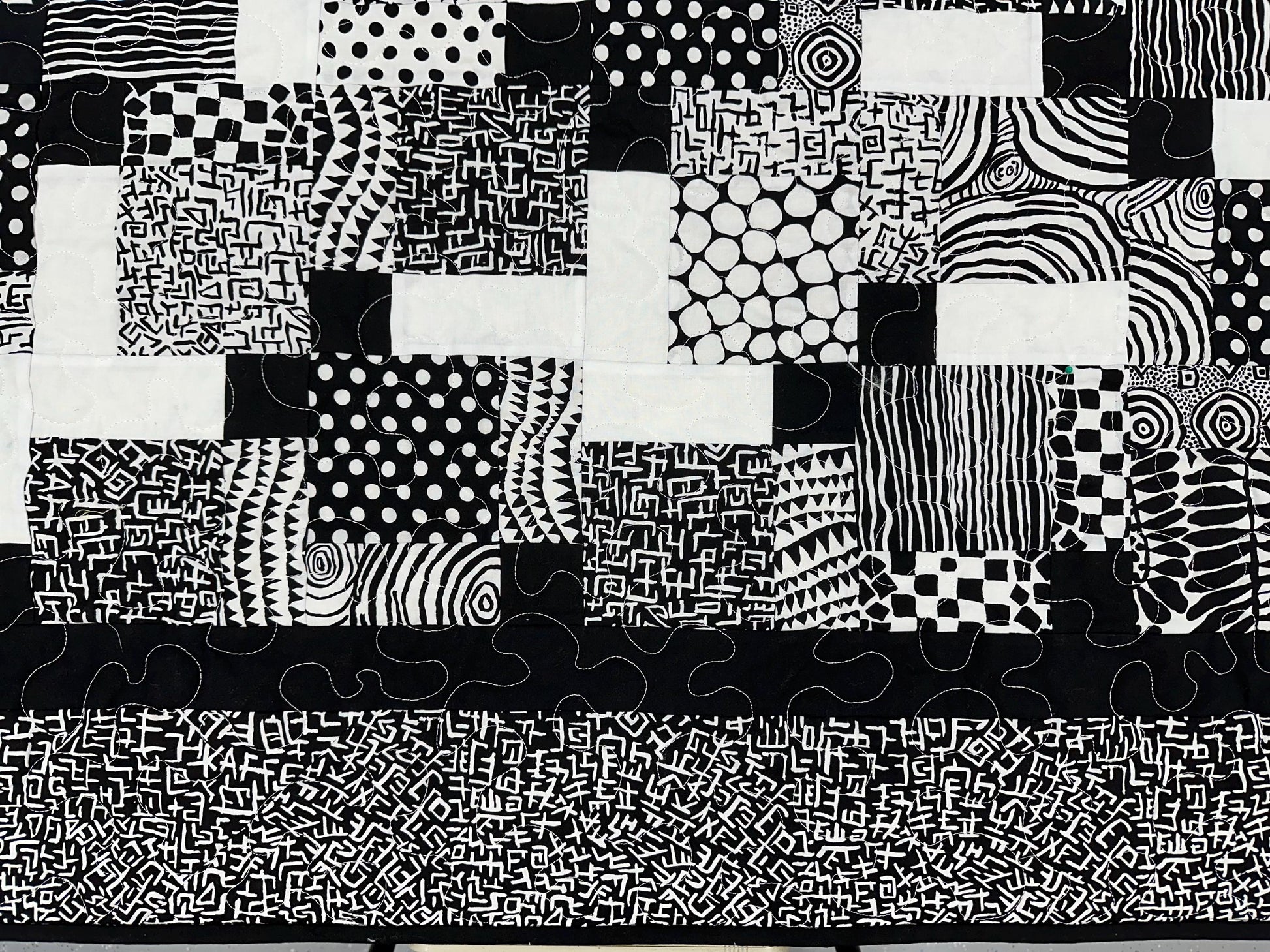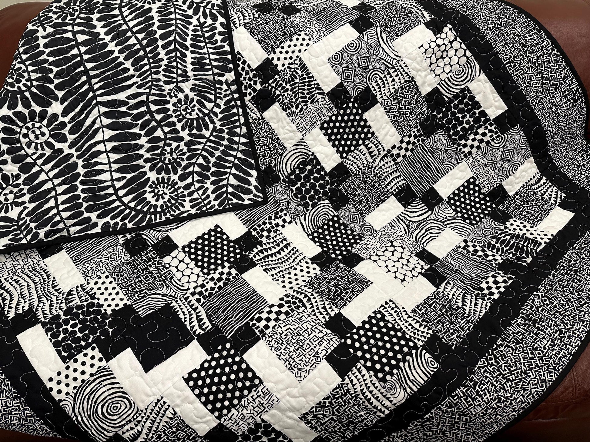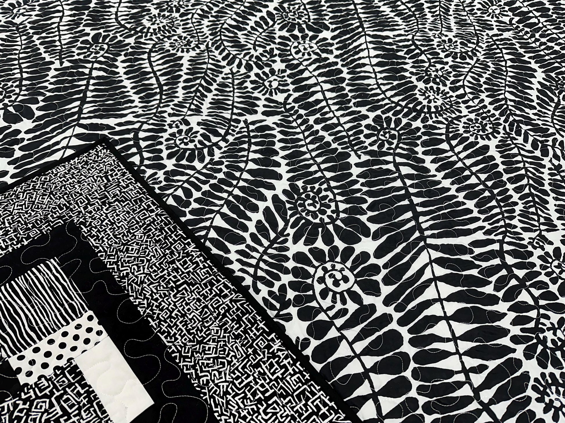 Borders and Backing: The inner border is a solid black and the outer border is a black crosshatch print. The backing fabric is white with black stylized leaf fronds. The binding is solid black.