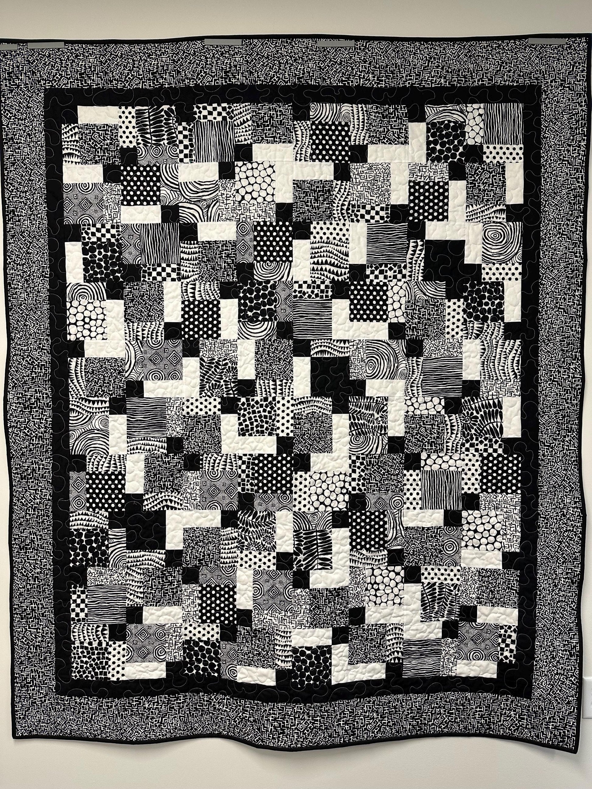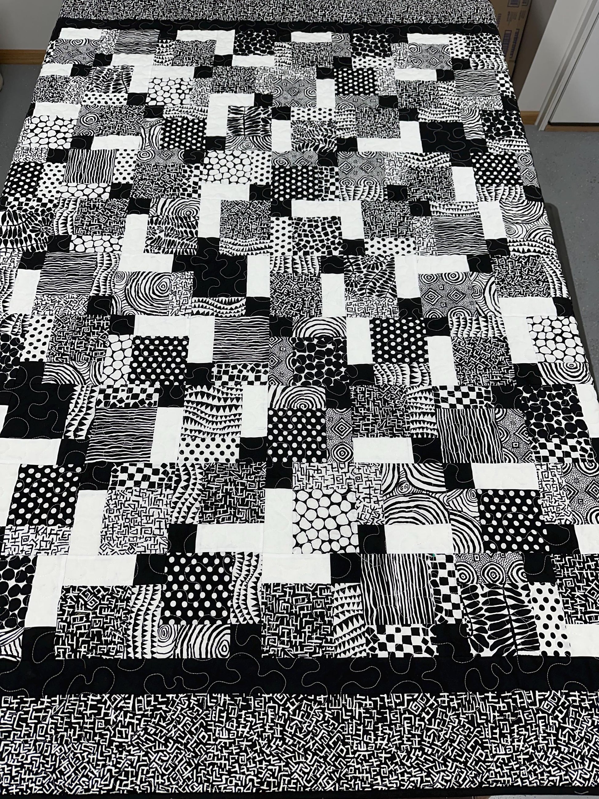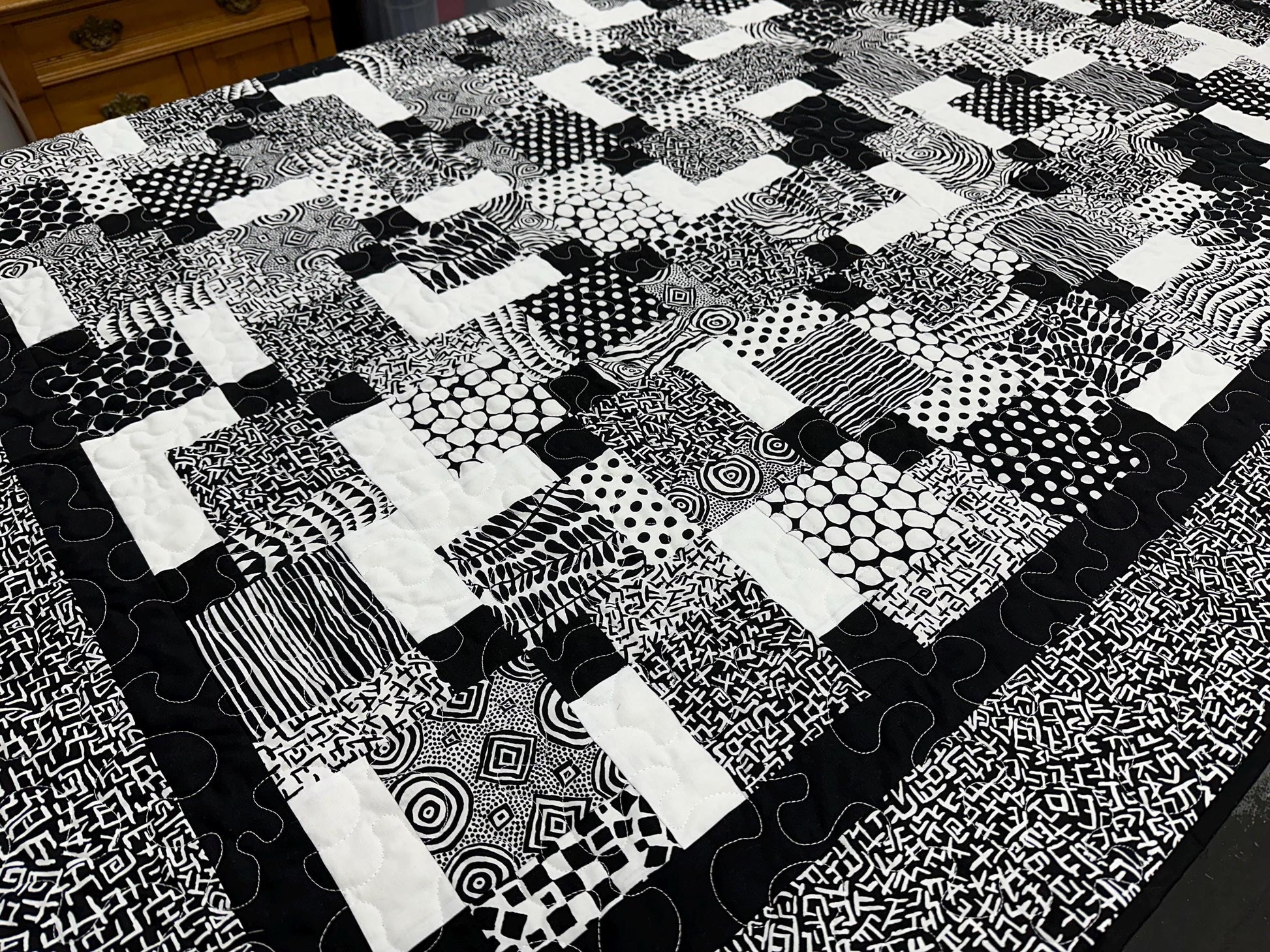 Go bold with this black and white modern patchwork quilt (64" x 78"). It is made of 100% cotton fabrics in black and white geometric motifs. This modern lap quilt is finished and ready to ship to you the next business day. This is a nice size to snuggle on the couch.