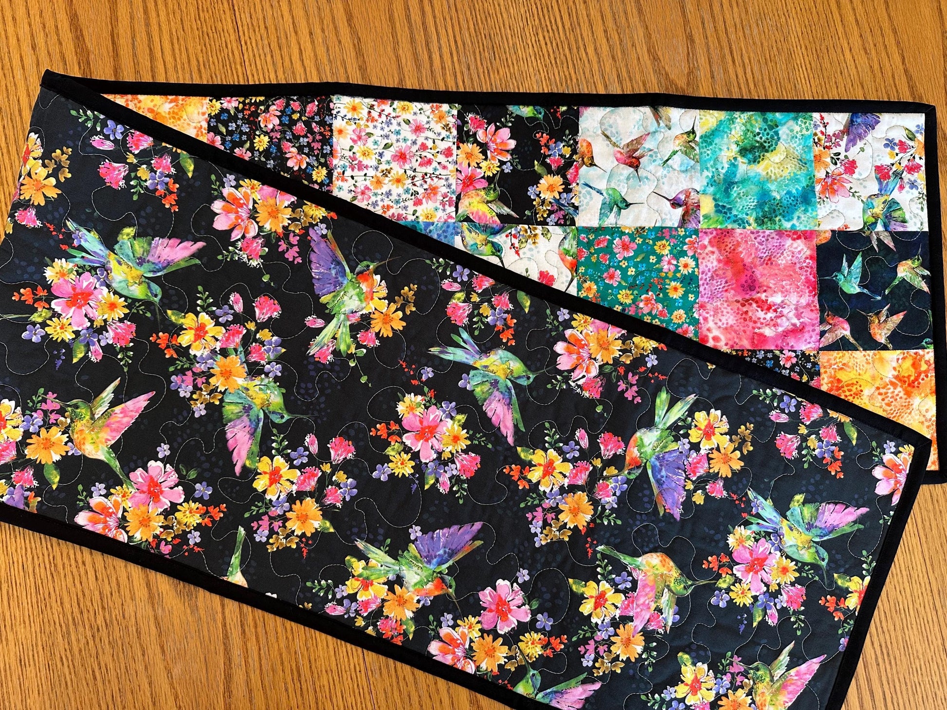 Reversible Quilted Table Runner: Hummingbirds & Flowers, 13 x 60, Kitchen Centerpiece, Dining Room Decor