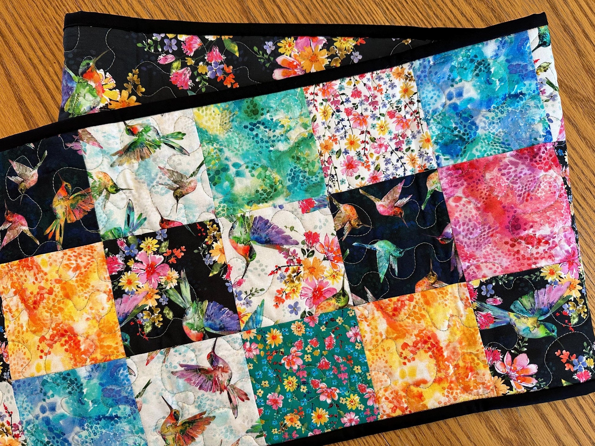 The reversible backing is a beautiful black floral hummingbird print trimmed with a black binding. It is machine pieced and quilted.