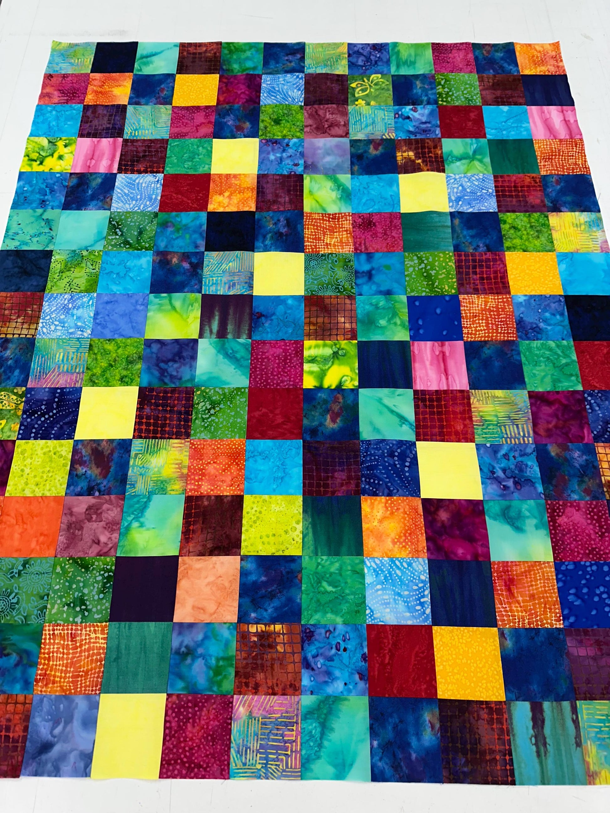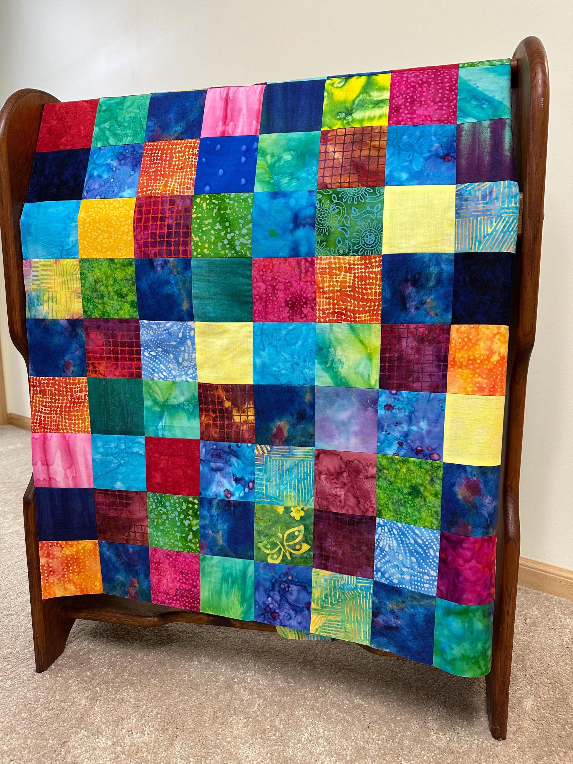 Fabric: This lap quilt is machine pieced and made with many different multi-colored batik 100% cotton fabrics.