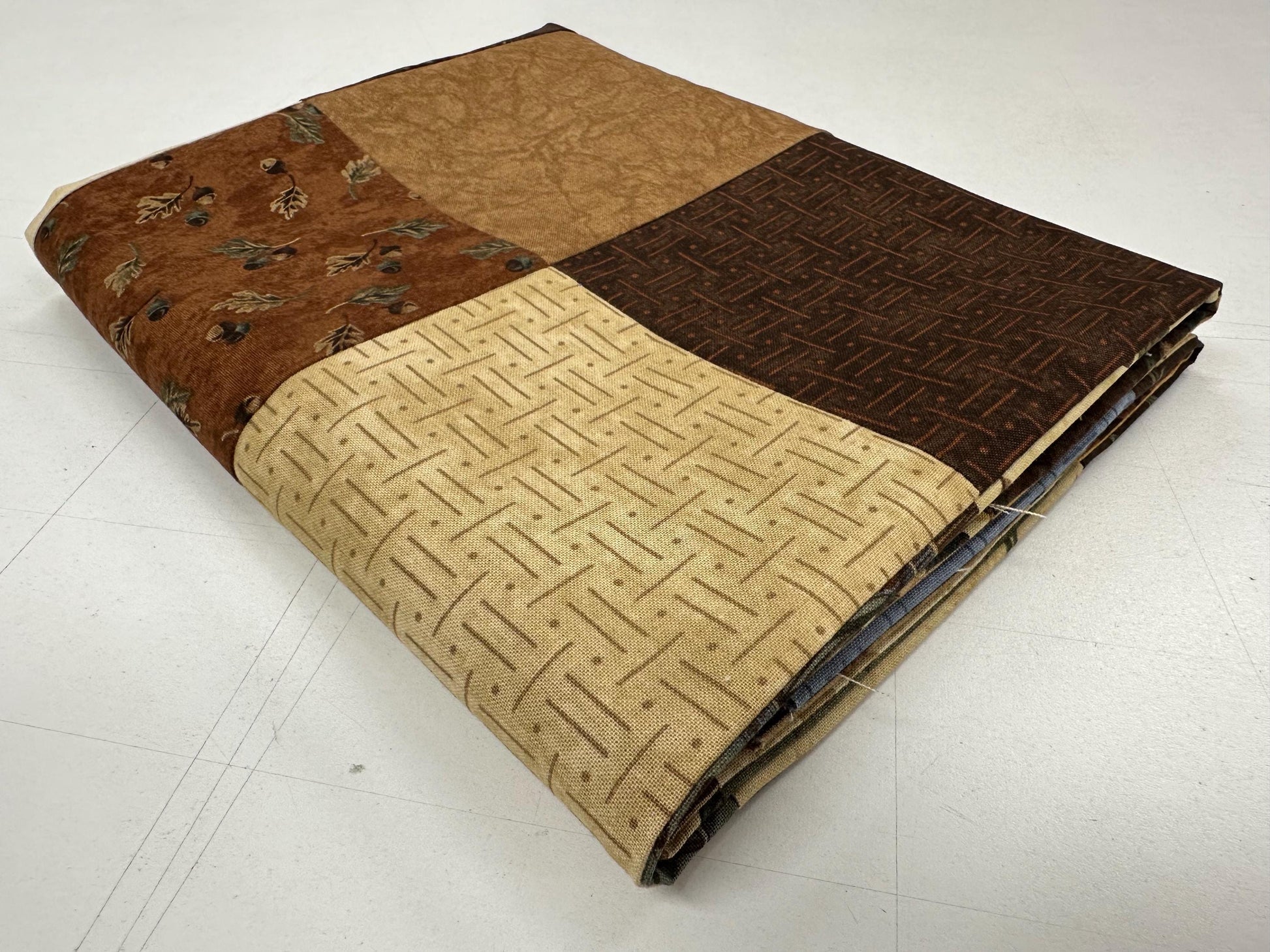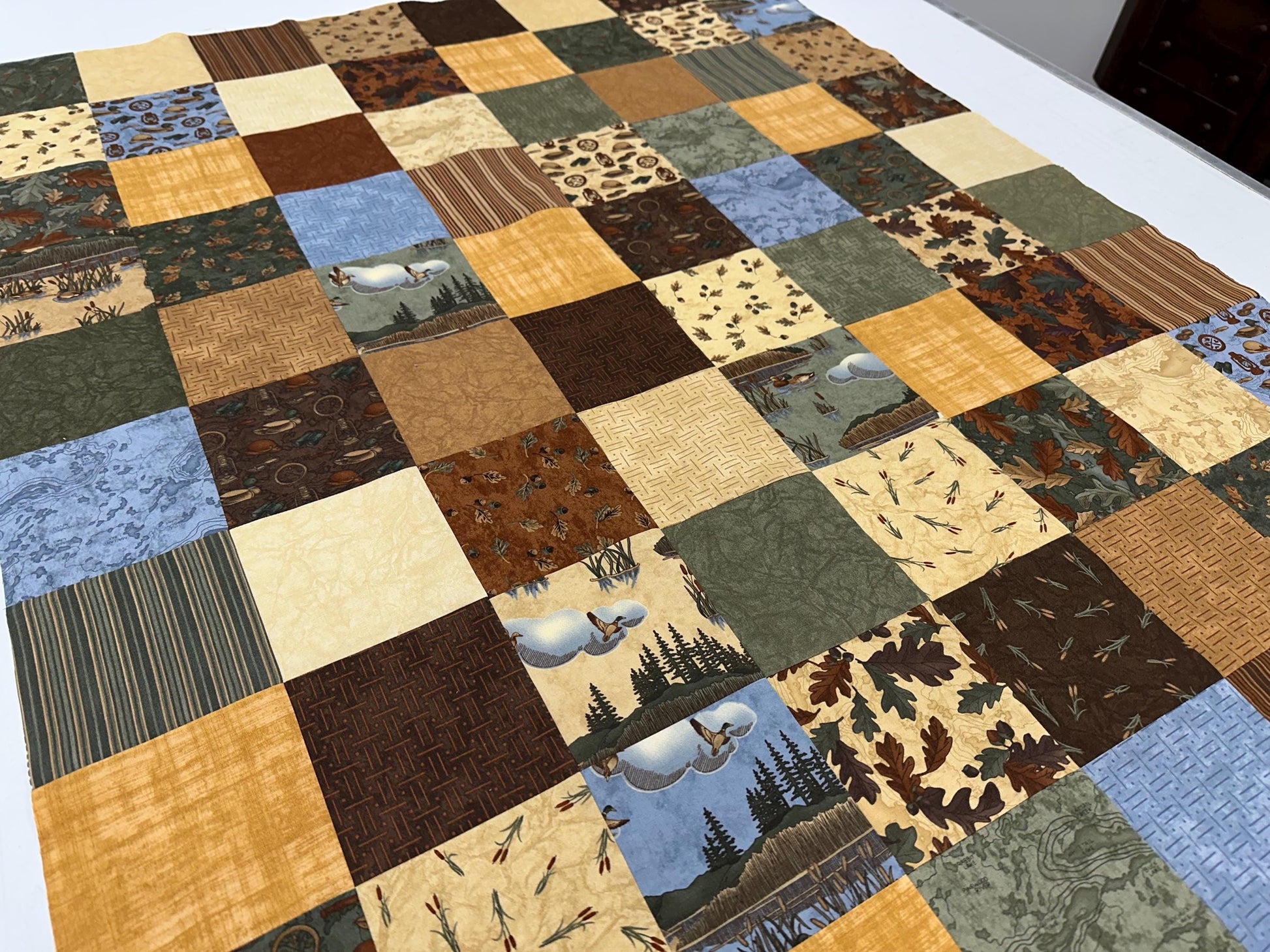 A beautiful new handmade quilt top (36" x 45" small lap size) made of quilt shop quality 100% cotton prints in green, brown, blue, and cream. The fabrics have a lake/fishing/bird/lodge theme. Once finished, this would make a pretty quilt for over the back of the couch or at the foot of a bed . A handmade quilt brings a sense of warmth and comfort to a room whether you use it to stay warm or to add a pop of color. This could also be used as a wheelchair lap quilt. This would make a nice gift for the men as they like quilts too.