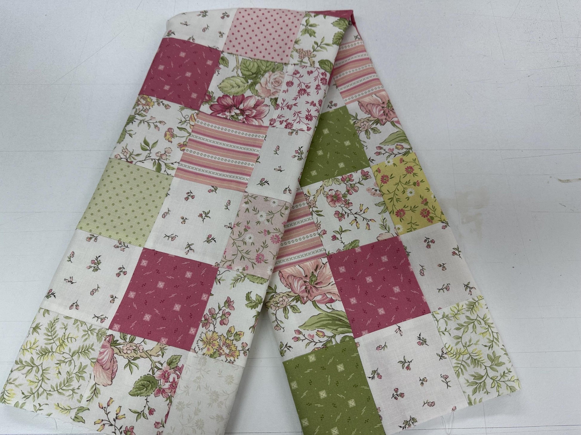 This unfinished floral quilt top is handmade in the United States and measures 36" x 45". It features various shades of green and pink floral fabrics, making it a unique and colorful addition to any home decor. Perfect for use as a lap quilt or sofa throw, this quilt top allows for customization and personalization to suit your style and preferences. Add your own creative touch to this beautiful piece of craftsmanship.