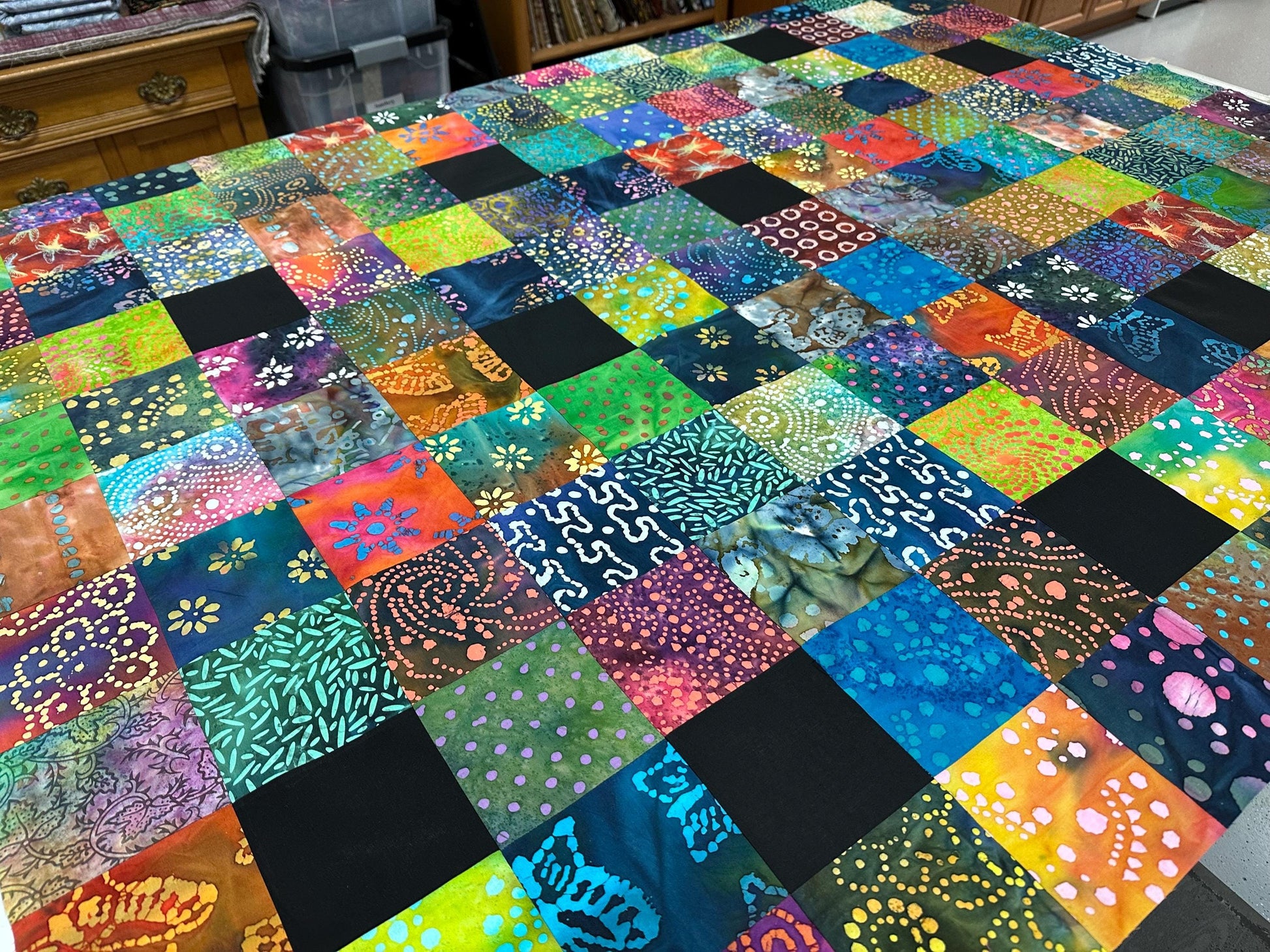 Fabric: This lap quilt is machine pieced and made with many different batiks in rainbow shades of blue, yellow, red, green, pink, orange, and solid black.